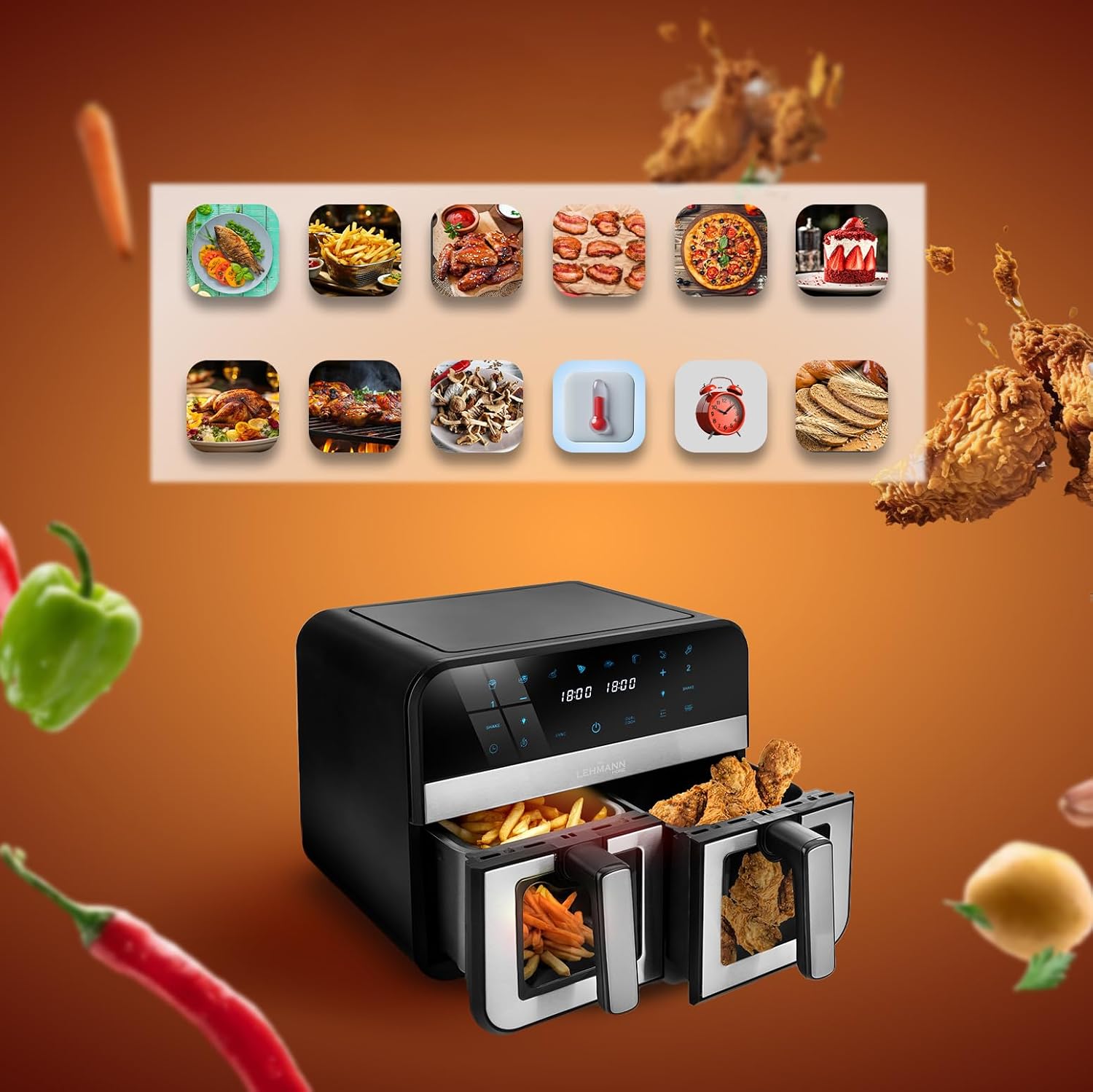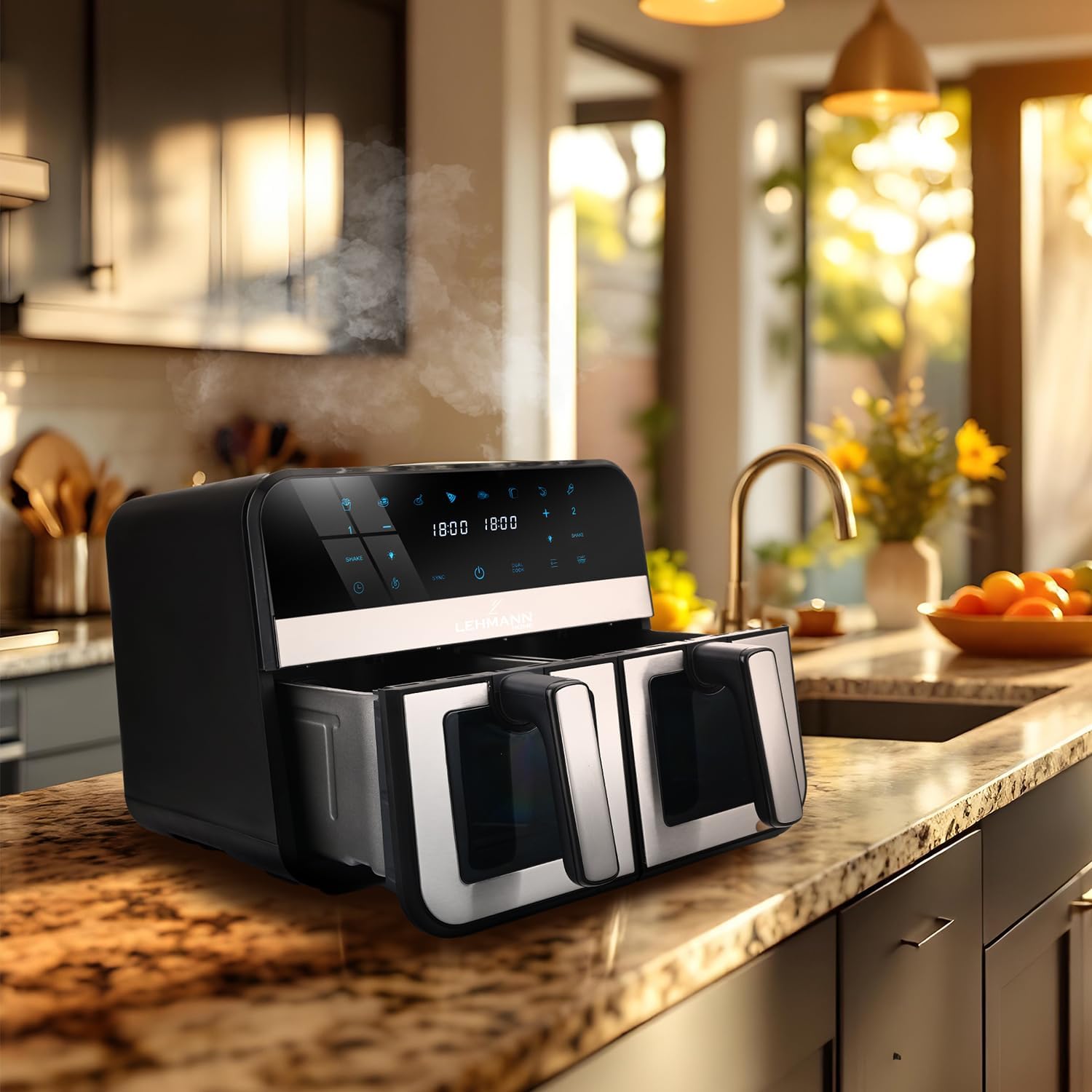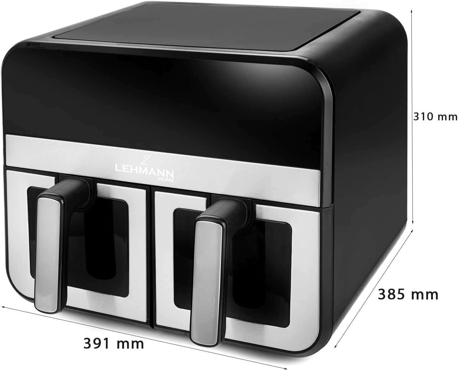 Фритюрник с горещ въздух LEHMANN с 2 камери и прозорец за наблюдение, 9 л, 2400 W, XXL с 12 програми, до 200°C, WiFi, Фритюрник без олио с технология за пържене с горещ въздух - печене на скара, печене, ферментиране