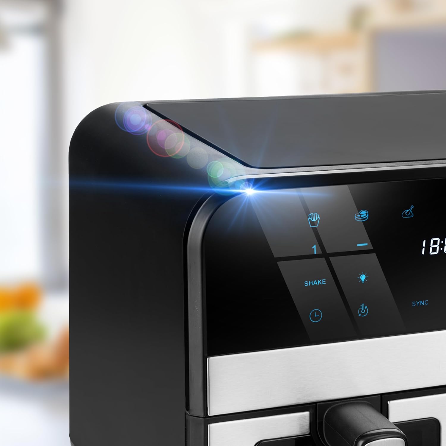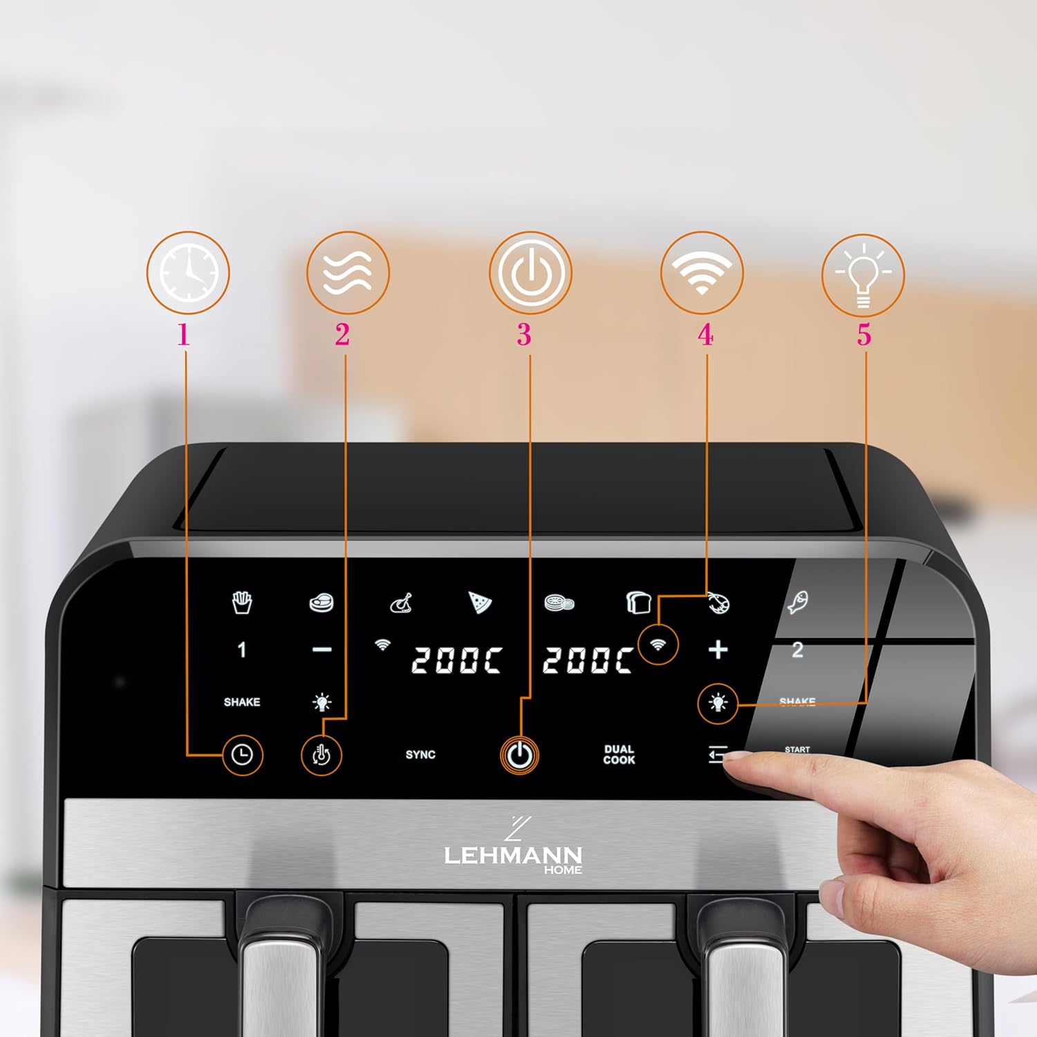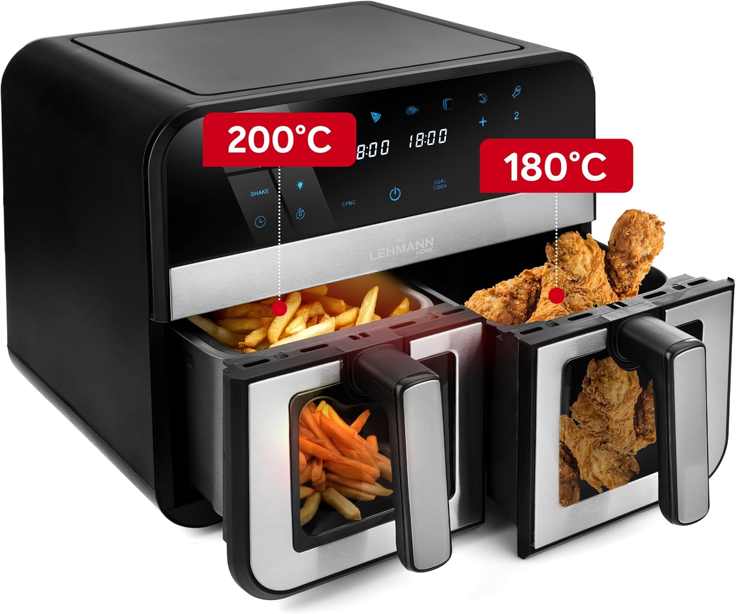 Фритюрник с горещ въздух LEHMANN с 2 камери и прозорец за наблюдение, 9 л, 2400 W, XXL с 12 програми, до 200°C, WiFi, Фритюрник без олио с технология за пържене с горещ въздух - печене на скара, печене, ферментиране