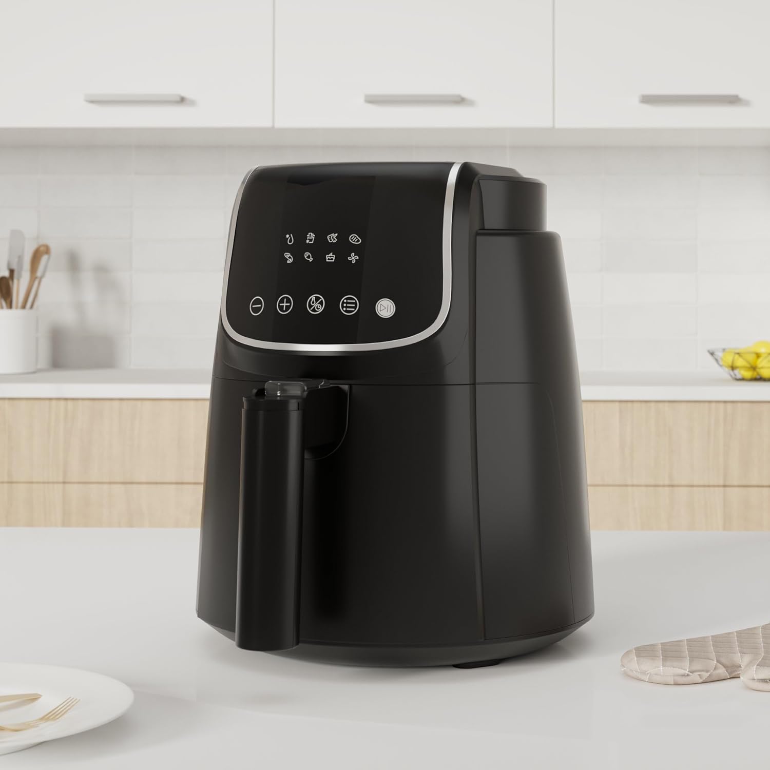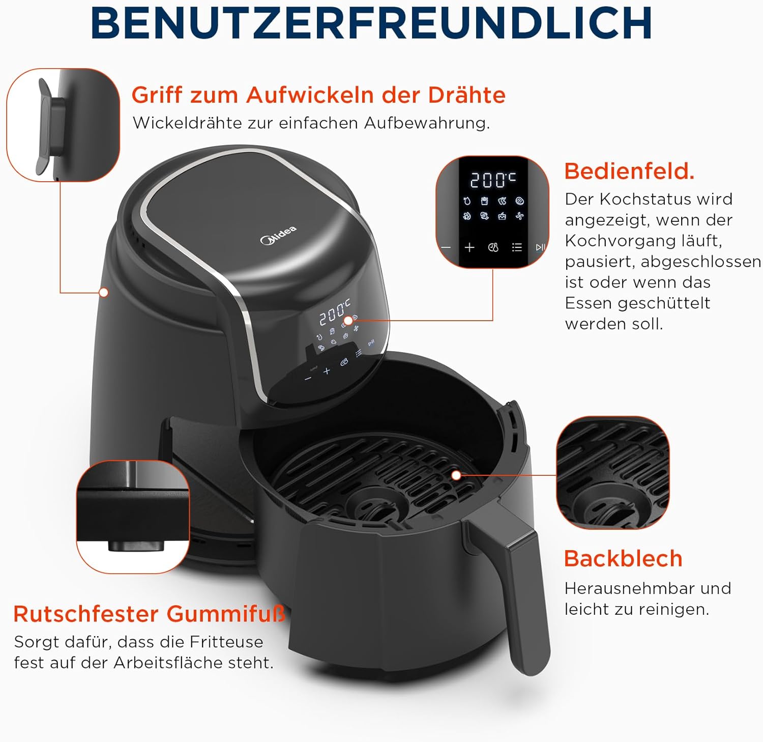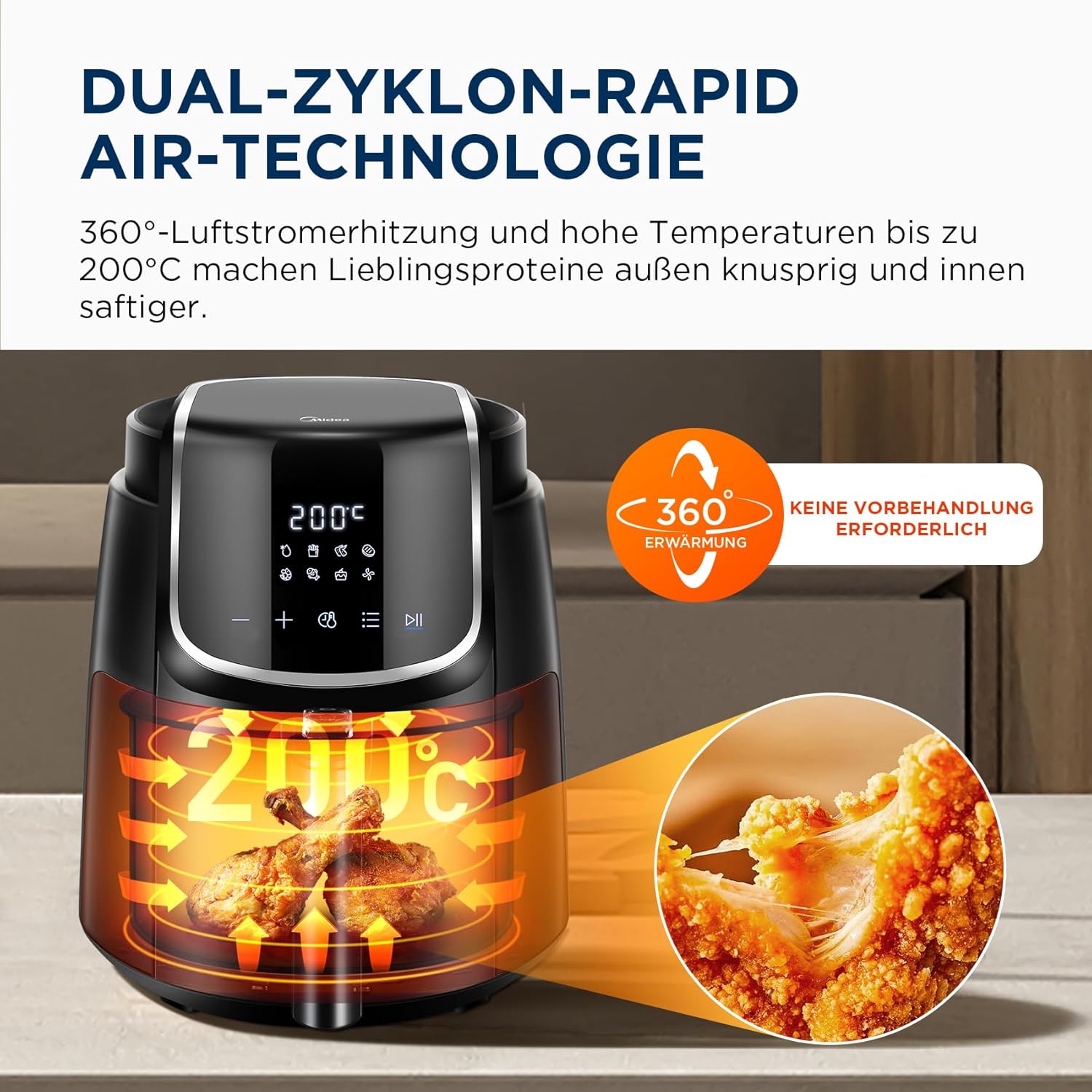 Фритюрник с горещ въздух Midea AirFryer 4 л с LED сензорен екран, 35-200°C, 8 функции за готвене, подходящ за съдомиялна машина, печене, грил, размразяване, аларма за разклащане, технология HeatXpress, 90% по-малко олио