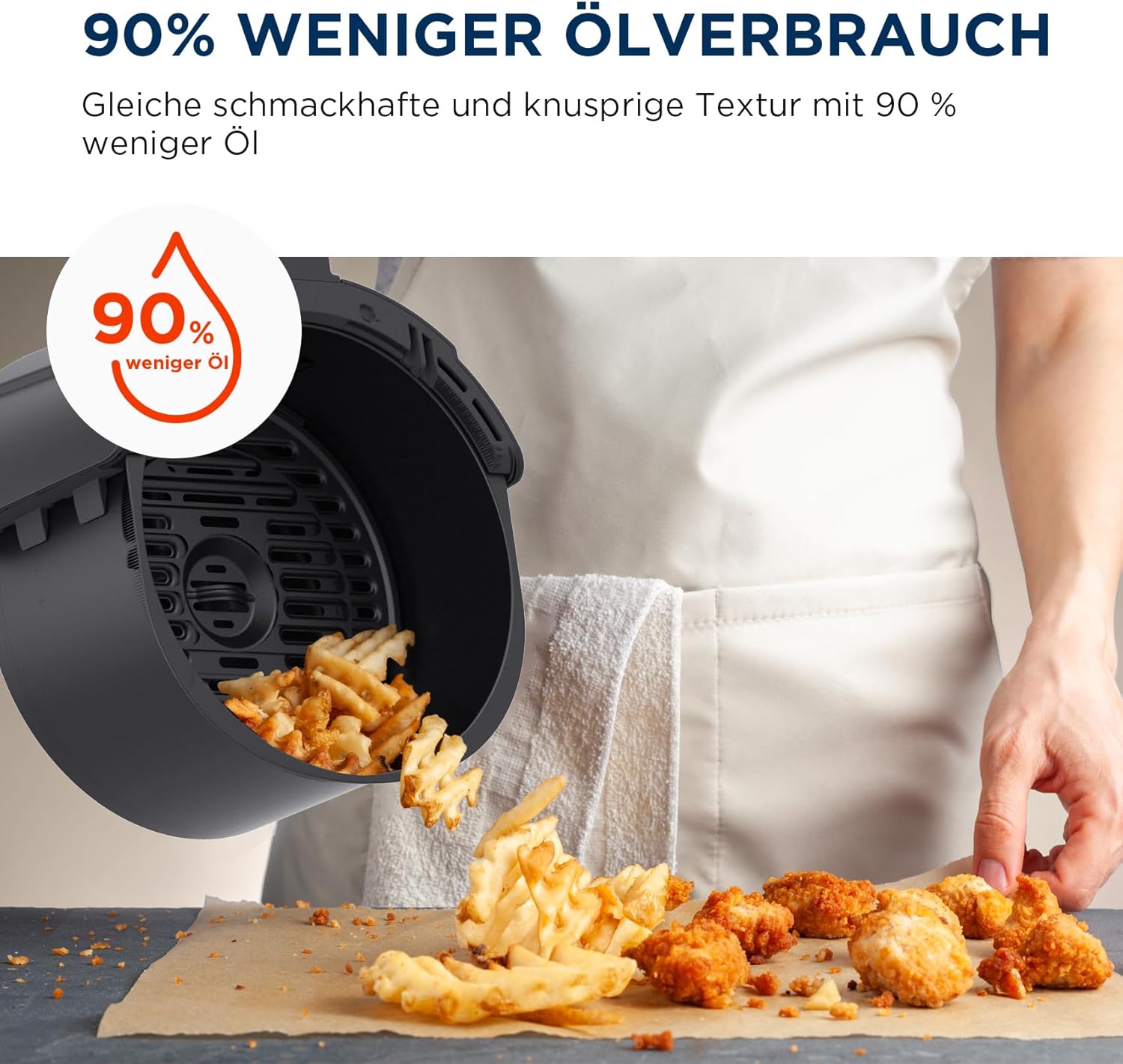 • Здравословно готвене: благодарение на усъвършенстваната технология за рециркулация, Mini Airfryer приготвя малки хапки с хрупкава консистенция на традиционно пържена храна с до 90% по-малко олио.