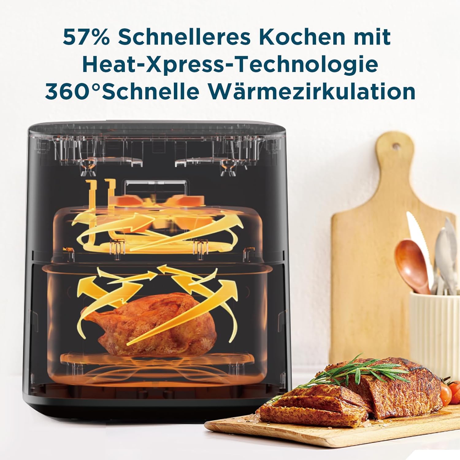 • Дайте воля на креативността си: мултикукърът 5 в 1 за пържене, гриловане, печене, запичане и размразяване. С мощност 1150 вата и технология за рециркулация, той гарантира дори хрупкави ястия.