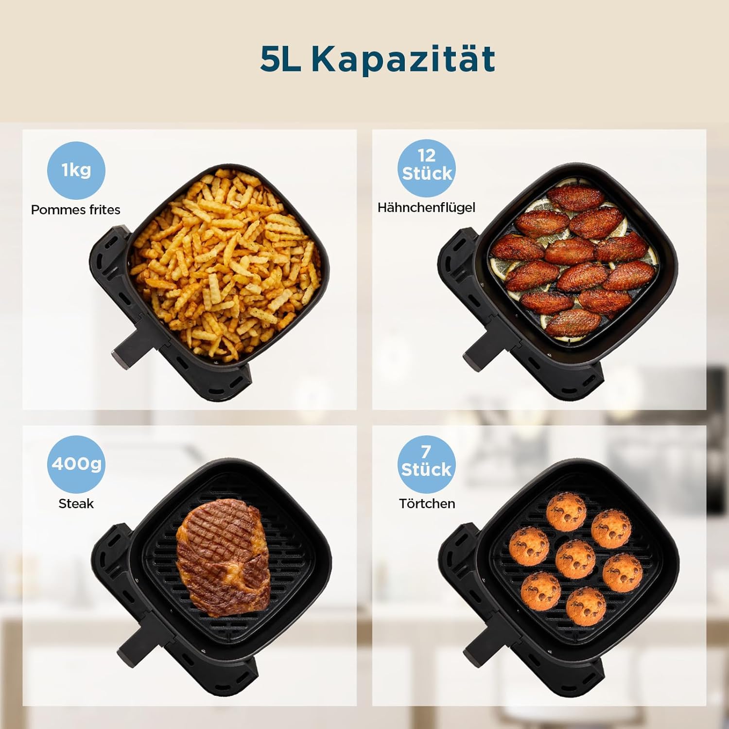 Фритюрник с горещ въздух Midea, капацитет 5 л, технология HeatXpress, 90% по-малко олио, пестене на енергия и време със 7 предварителни настройки, прозорец за лесен преглед и светлина, незалепващо покритие, черен