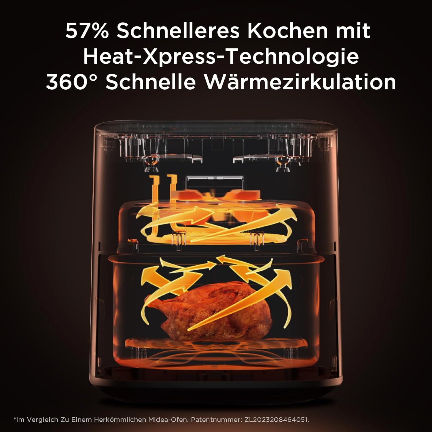 Фритюрник с горещ въздух Midea с капацитет 7 л, технология HeatXpress, 90% по-малко олио, енергия и време, 7 предварителни настройки, прозорец за лесен преглед и светлина, незалепващо покритие, черен