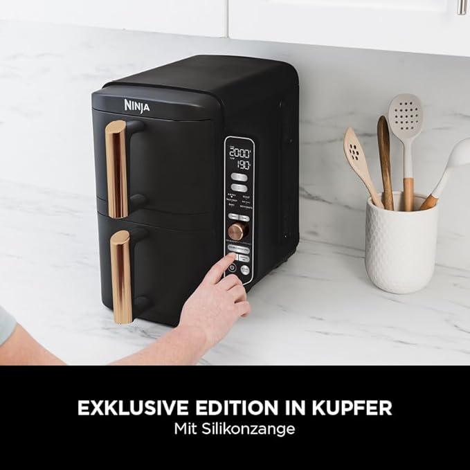 Фритюрник с горещ въздух Ninja Double Stack XL, 2 вертикални чекмеджета, 4 нива на готвене, 2 отделения, компактен дизайн, капацитет 9,5 л, 6 функции, 8 порции, щипки, черен/меден SL400EUCP