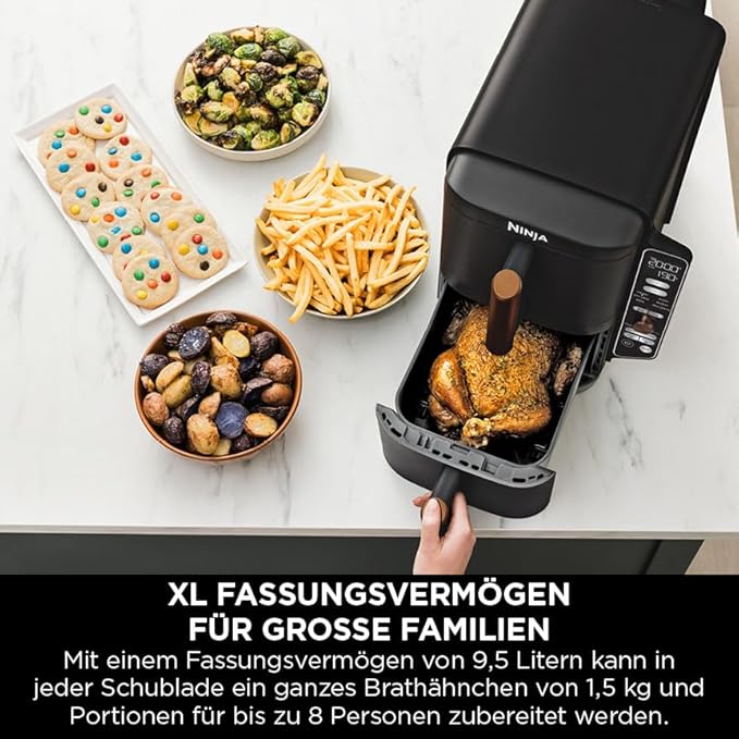 • Включва: Фритюрник с горещ въздух Ninja Double Stack 9.5 л (щепсел за ЕС), 2 x 4.75 л чекмеджета, 2 незалепващи решетки за свежи плодове, 2 решетки, силиконови щипки. Части, подходящи за съдомиялна машина. Размери: В38.5 см x Ш28 см x Д47 см Тегло: 10.3 кг Цвят: черен/меден