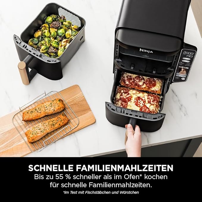 • 6 функции за готвене: Max Crisp, пържене с горещ въздух, печене, печене, претопляне, дехидратиране. До 75% по-малко мазнини* с функцията за пържене с горещ въздух (*Тествано в сравнение с пържени, ръчно нарязани картофи). Функции SYNC & MATCH в 2 чекмеджета