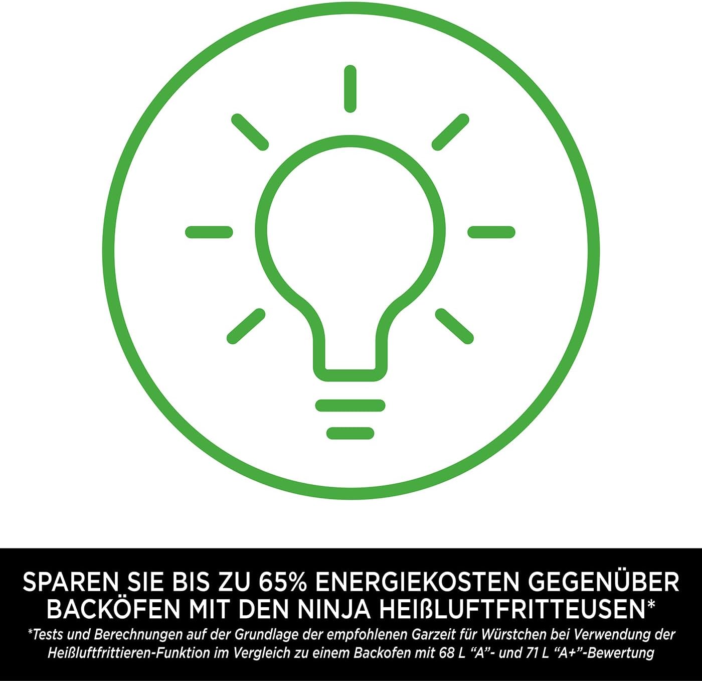 • Спестете до 65% от разходите за енергия с фритюрниците с горещ въздух Ninja: спестете енергия и време благодарение на Ninja. В сравнение с конвенционална фурна. Тестове и изчисления, базирани на препоръчителното време за готвене на колбаси при използване на функцията за пържене с горещ въздух, в сравнение с фритюрници с клас "A" от 68 л и 71 л "A+".