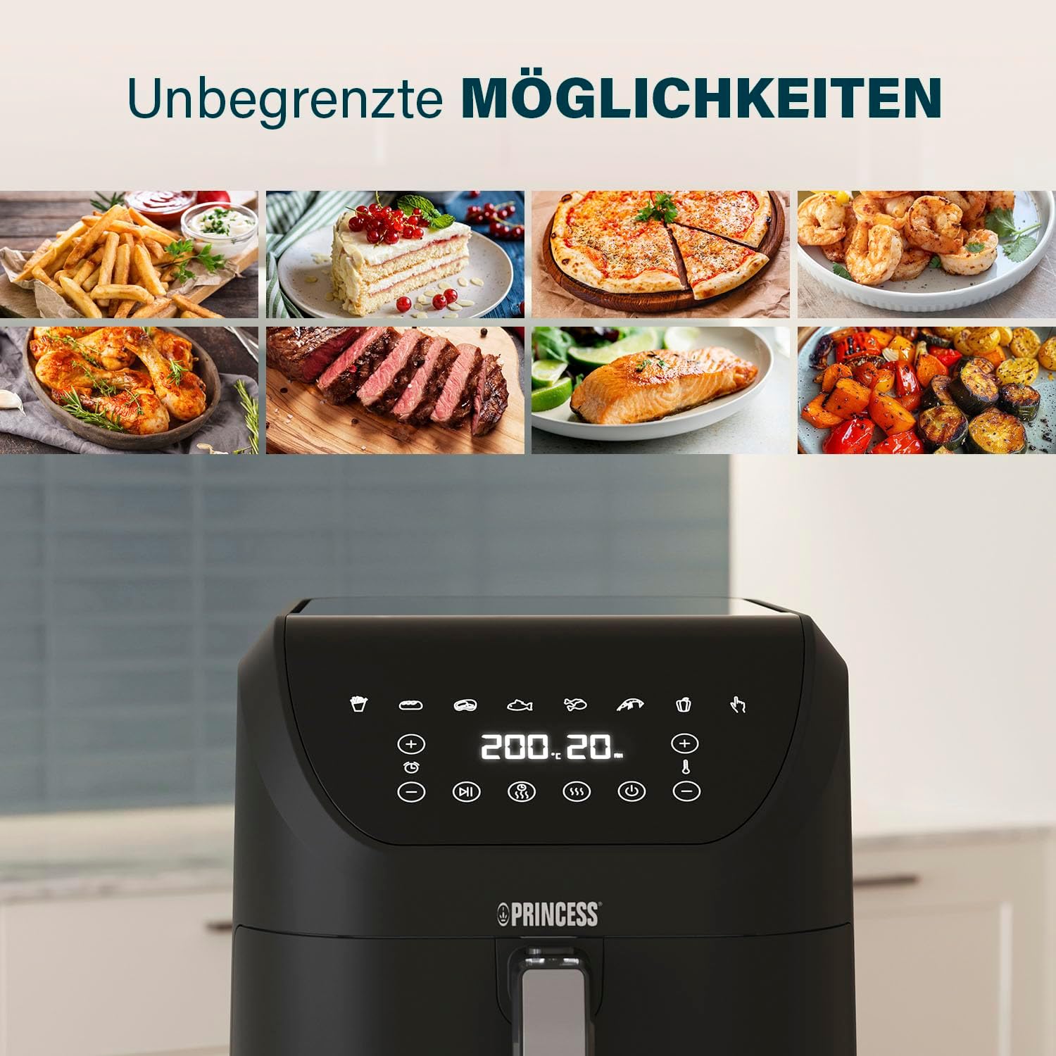• Интелигентно управление с 8 програми: сензорен контролен панел, избор на температура (80-200°C), 60-минутен таймер и автоматично изключване позволяват лесно пържене, печене и гриловане.