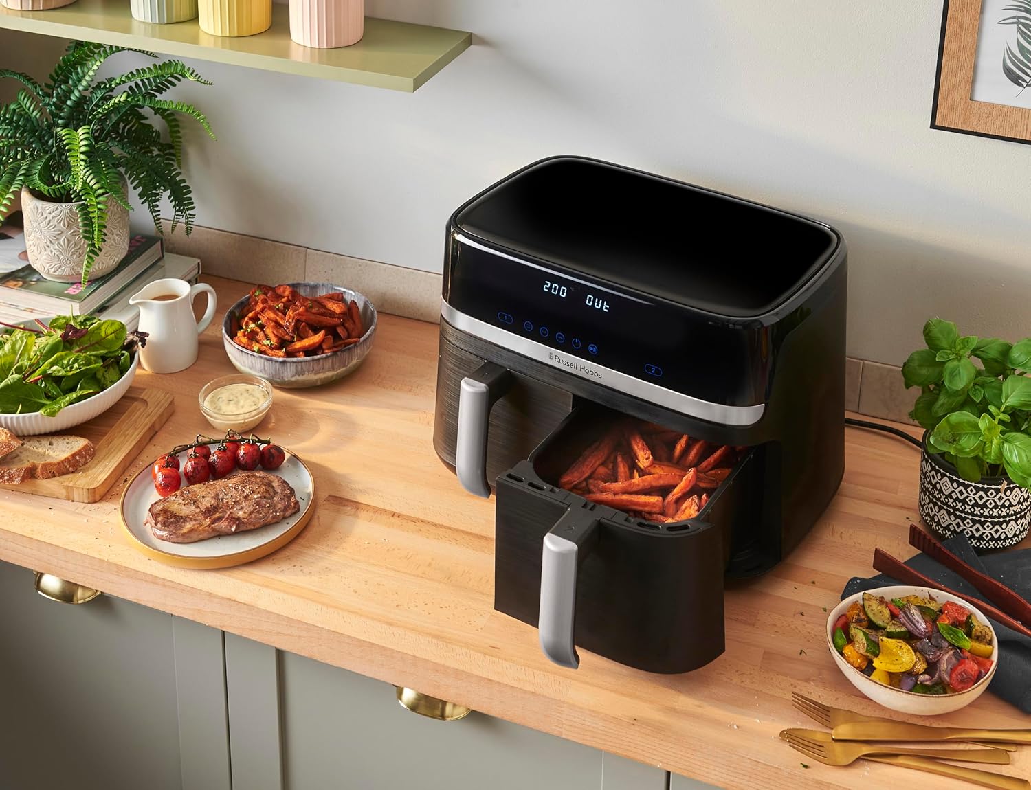 Фритюрник с горещ въздух Russell Hobbs SatisFry 27681-56, 2 отделения, 9 литра, бърз, с горещ въздух [2 отделения по 4,5 литра всяко, много тиха работа, 9 програми], фритюрник SatisFry (може да се мие в съдомиялна машина, функция Match & Sync)
