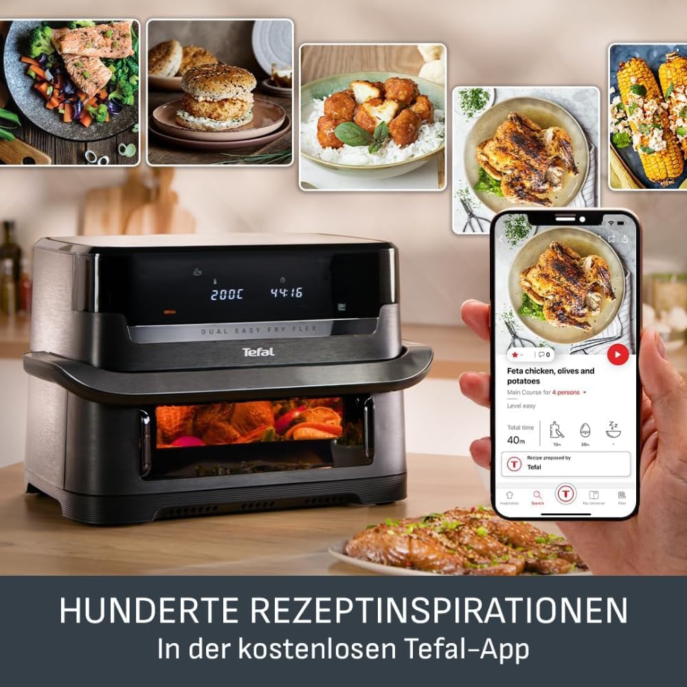 Фритюрник с горещ въздух Tefal Dual Easy Fry Flex, FlexCook Diverter, общ капацитет 9 л, 7 различни режима, 2 независими зони за готвене (5,5 л и 3,5 л), черен, EY9228E0