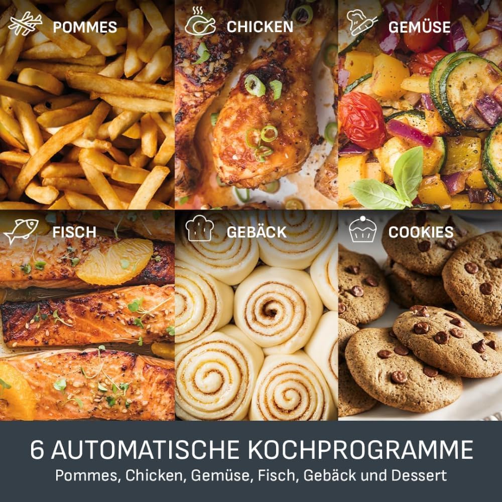 • Надеждно готвене: 8 автоматични програми за готвене (пържени картофи, хапки, печено пиле, пица, месо, риба, зеленчуци, десерт) за храна, която винаги е успешна, и безкрайни възможности за готвене