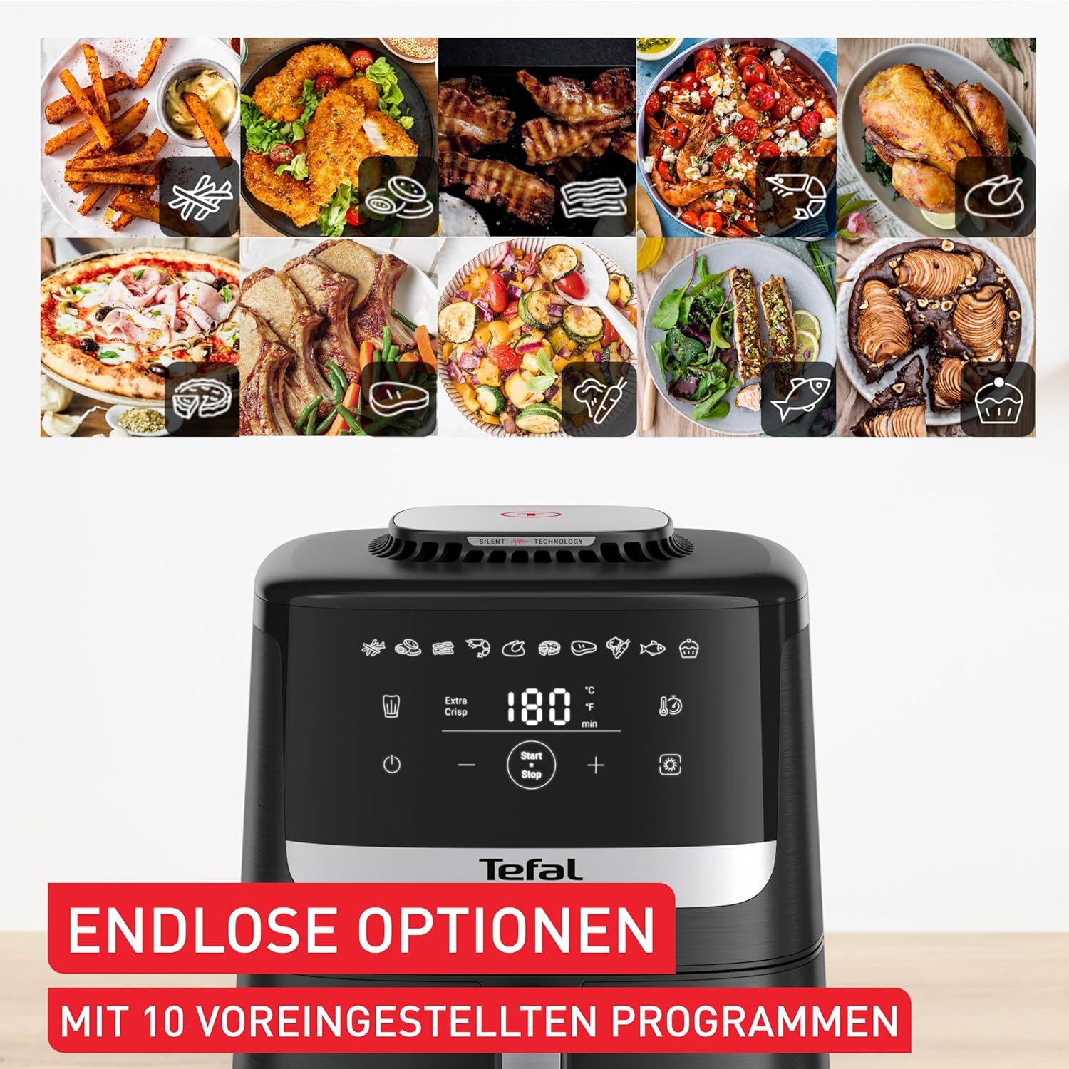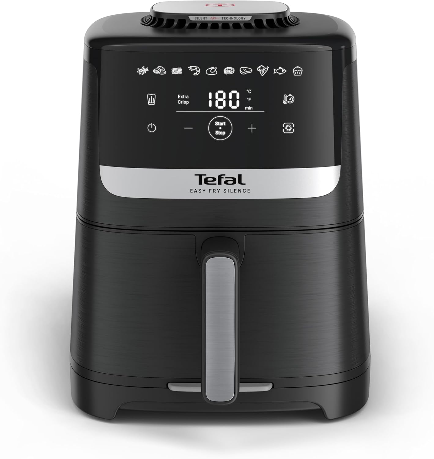 Фритюрник с горещ въздух Tefal Easy Fry Silence, до 99% по-малко мазнини, безшумна технология, 5 литра, включва незалепваща решетка за готвене, от 40°C до 220°C, лесно почистване, черен, EY5528