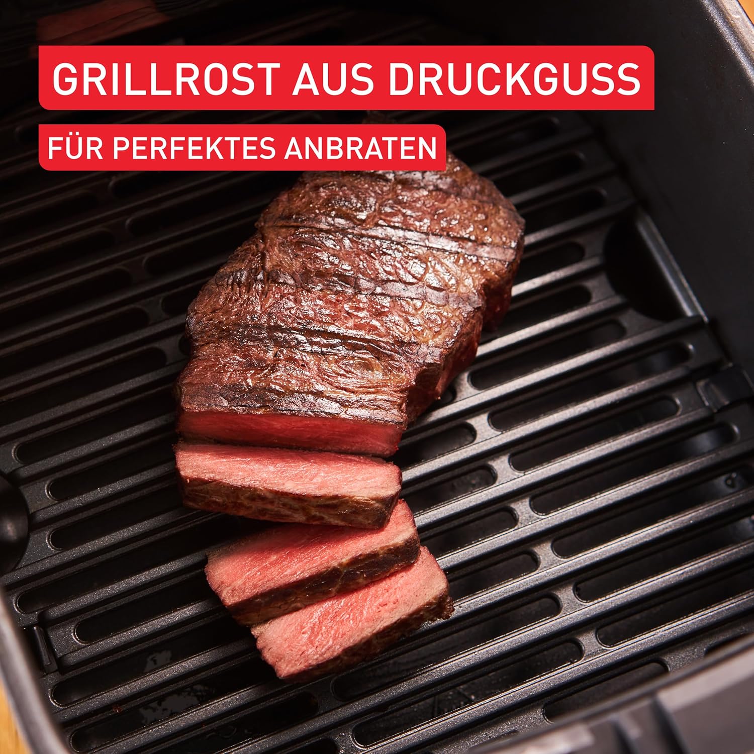 • Печене на скара без пушене: плоча за скара, изработена от лят алуминий за оптимално запичане с подходящи ленти за скара, с незалепващо покритие и приготвяне почти без пушене