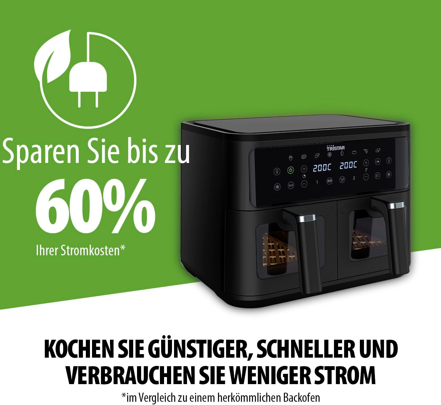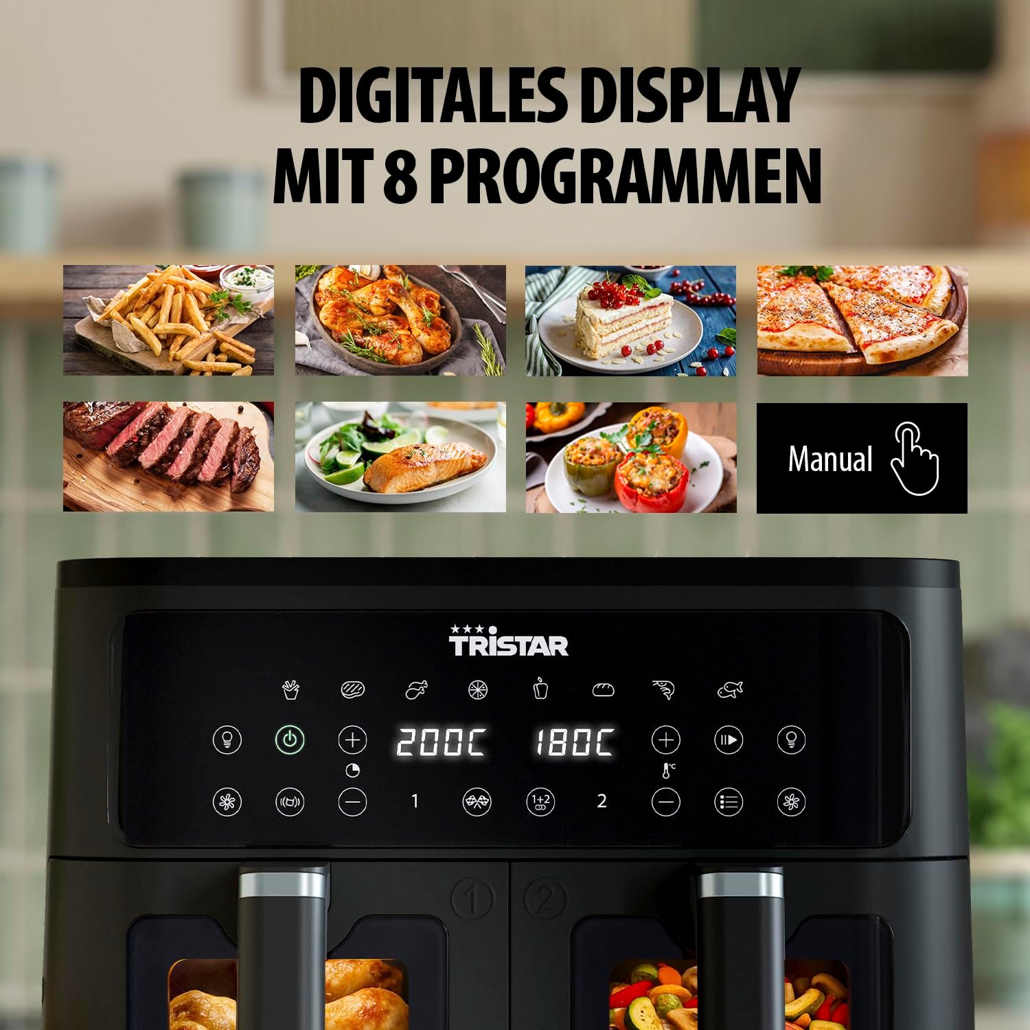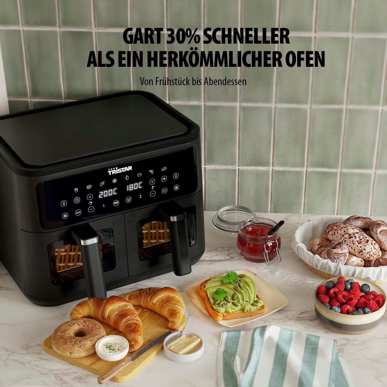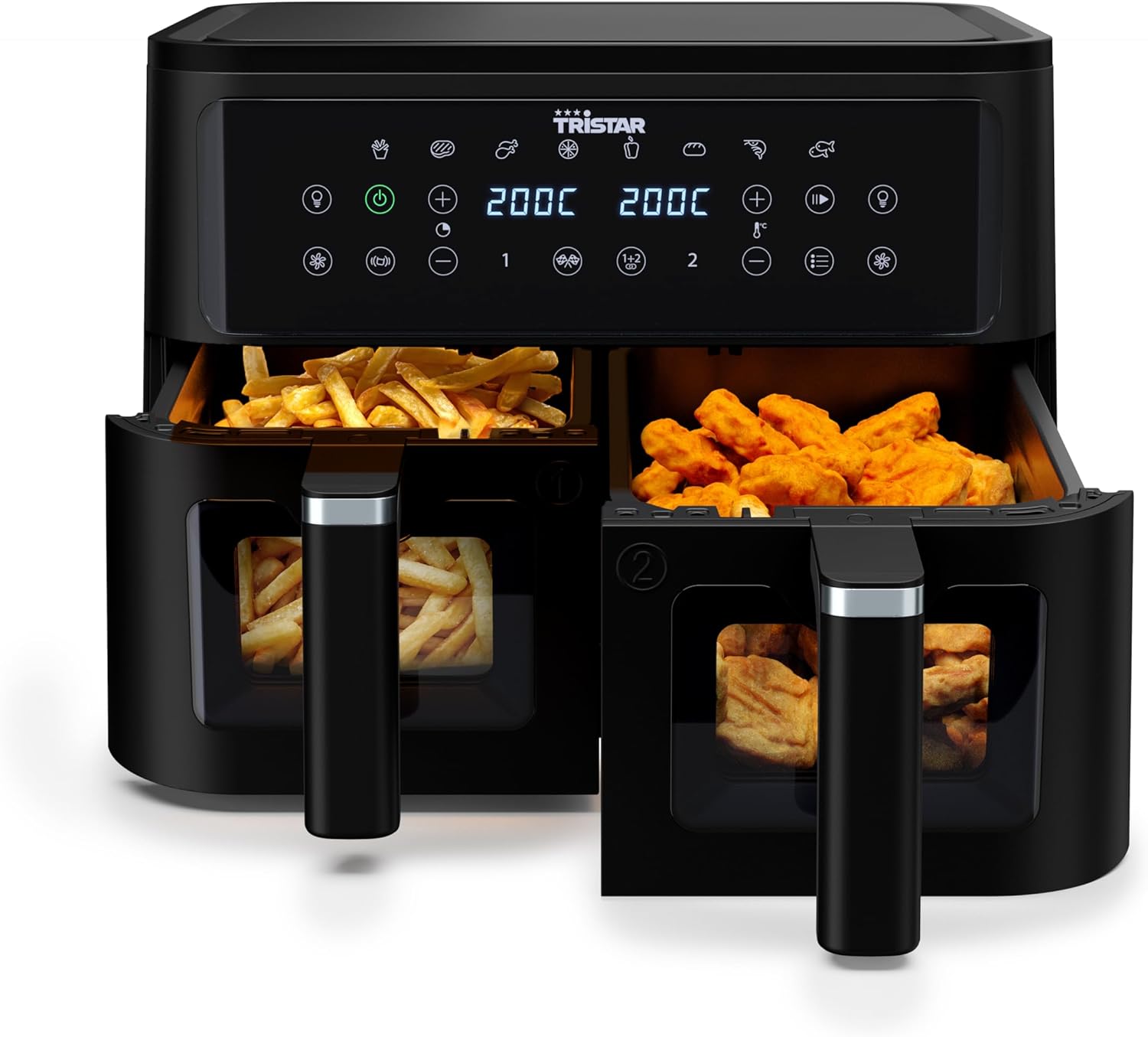 Фритюрник с горещ въздух Tristar с двойна кошница, капацитет 9 л, 10 програми, функция синхронизация, дигитален дисплей, прозорец за наблюдение, без PFAS, здравословно пържене без олио, 2500 W, FR-9429