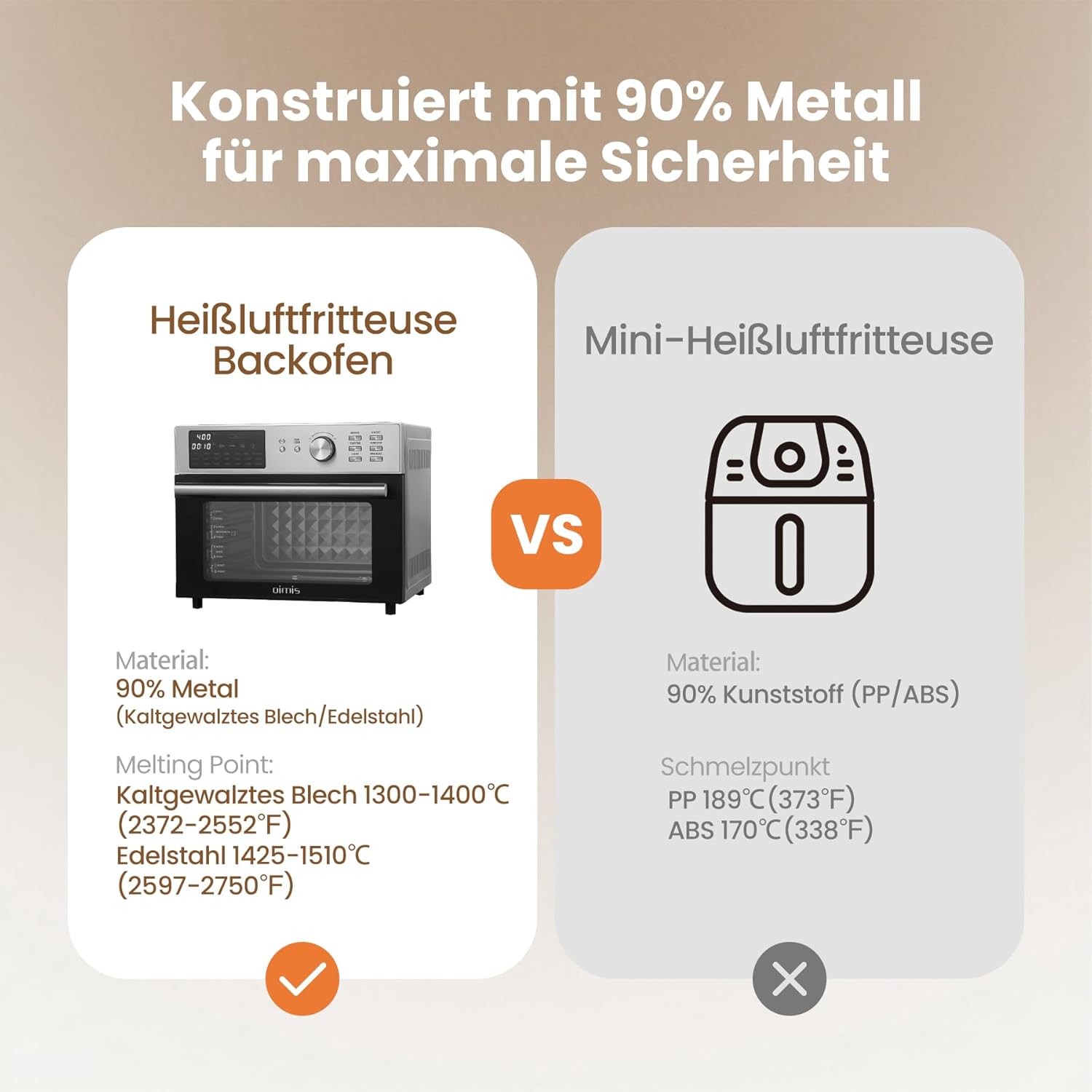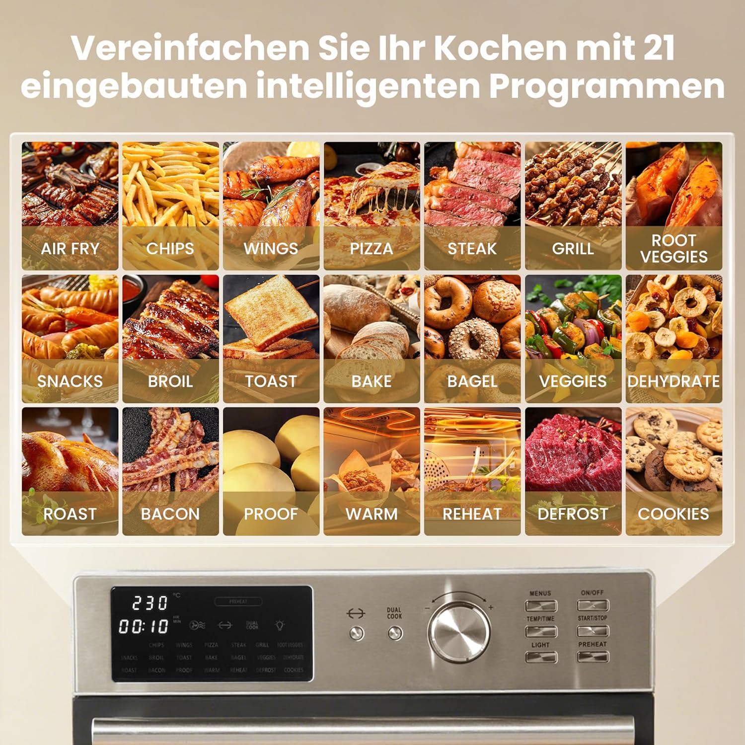 Умна фурна с фритюрник OIMIS, 21 предварително зададени програми, тостер за плот с фритюрник, фурна от неръждаема стомана 30 л със 7 аксесоара. Можете да правите каквото си поискате.