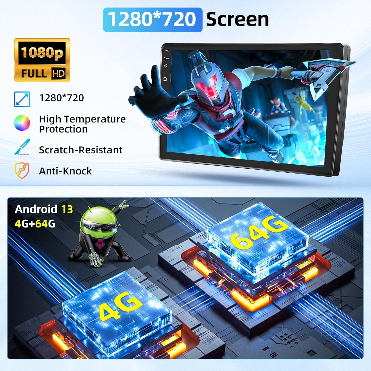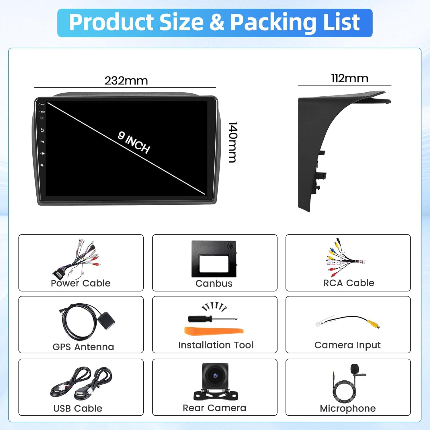 • 2G RAM + 64G ROM и най-новата Android система: стереото е с най-новата Android система, 2GRAM+64GROM, която поддържа по-добра производителност в превозни средства. Пълнокапацитетният 9-инчов HD сензорен екран е лесен за използване и предоставя детайлно изображение.