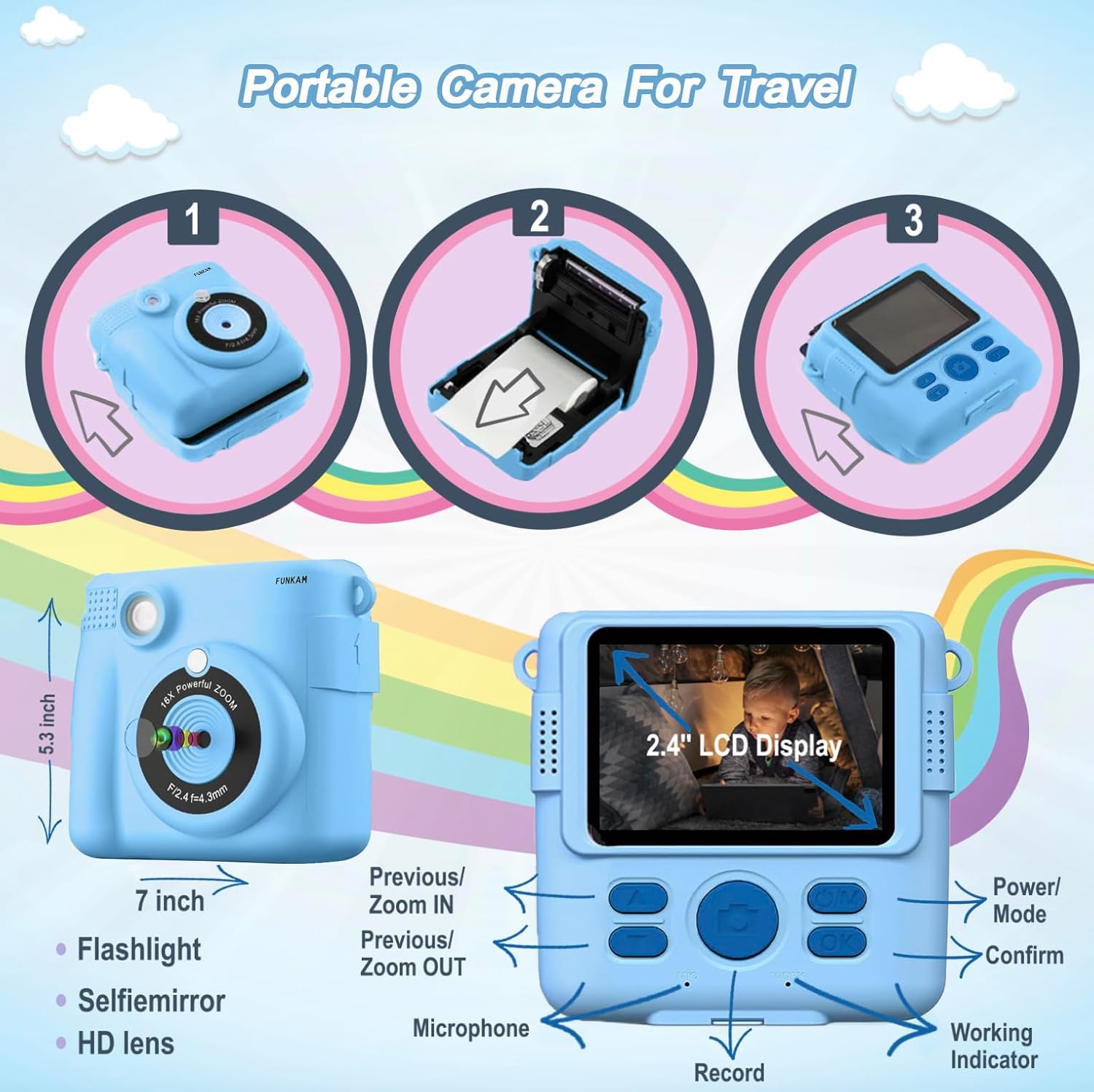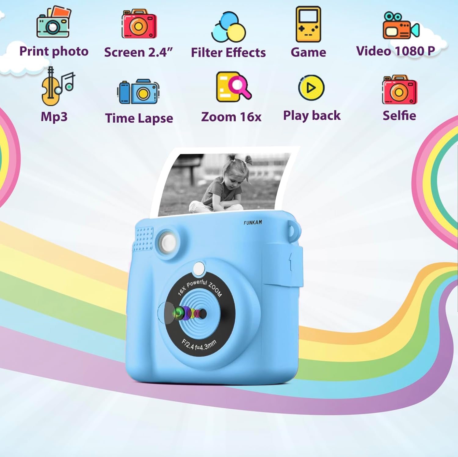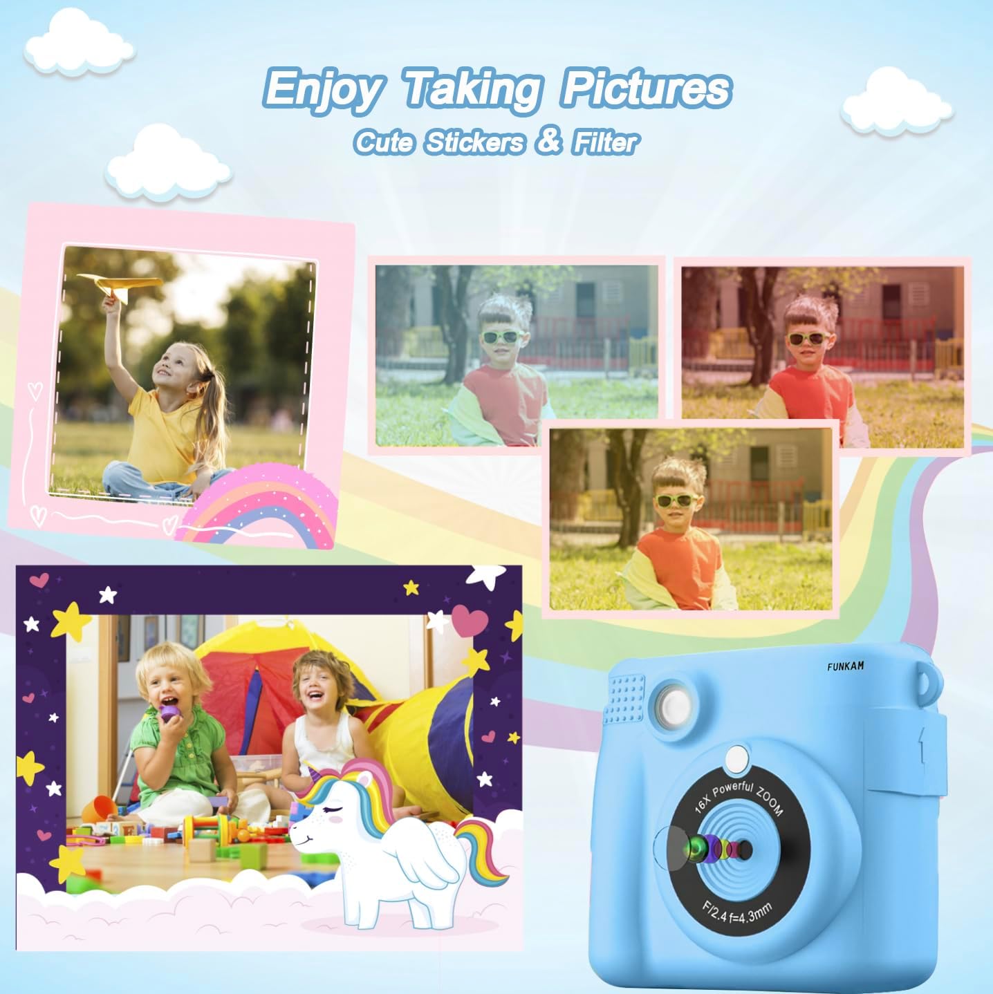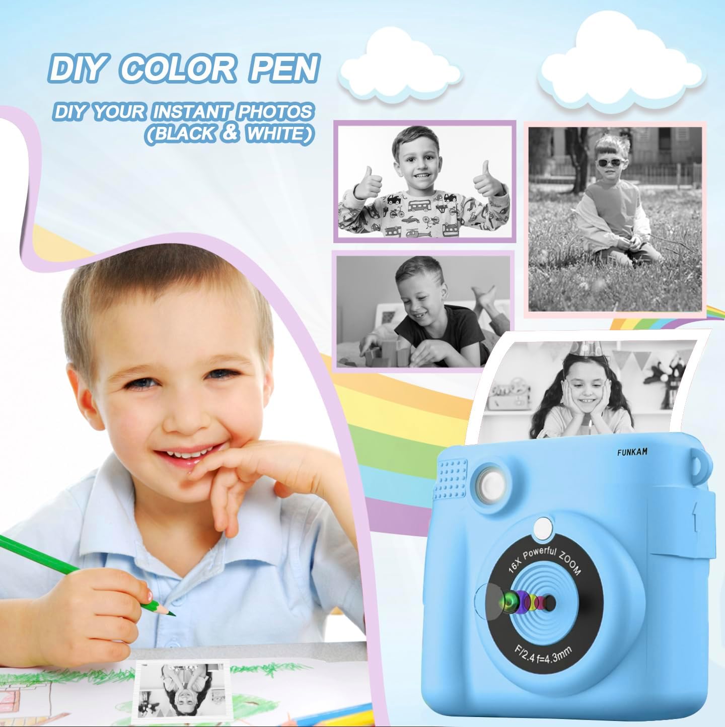 FUNKAM Детска камера за моментални снимки 1080P 2.4-инчов екран Детска камера за моментални снимки с хартия за печат и 32GB TF карта, цифрова камера за деца с цветни химикалки, подарък за деца 3-12 години
