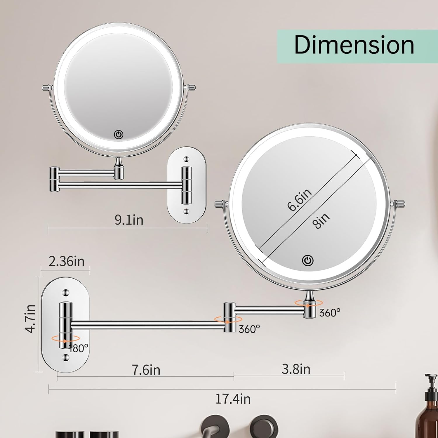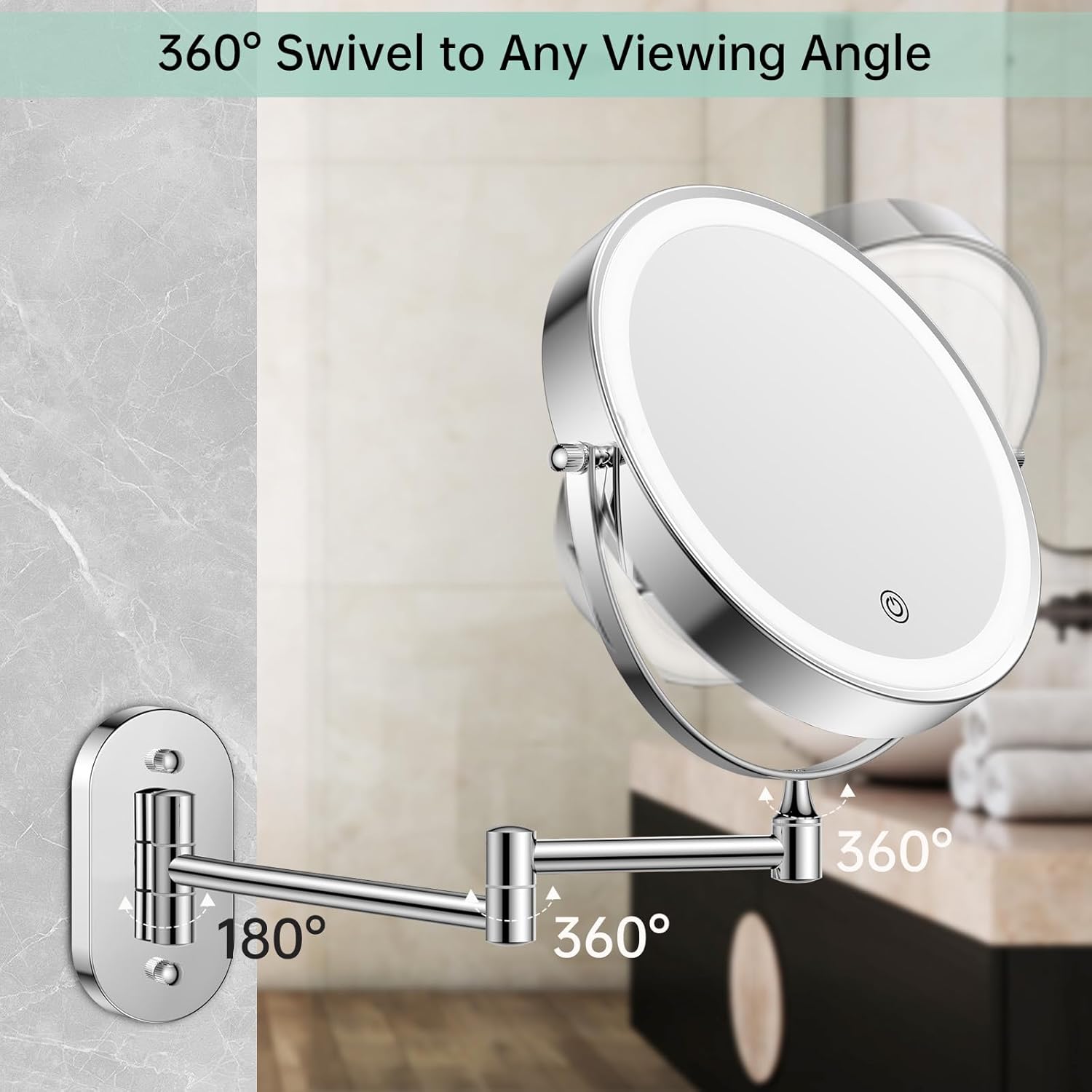 1. This illuminated make-up mirror with 15.4 inch extendable wrist allows 360° rotation. It offers you a comfortable viewing angle in the bathroom for make-up, shaving, wearing contact lenses, etc.