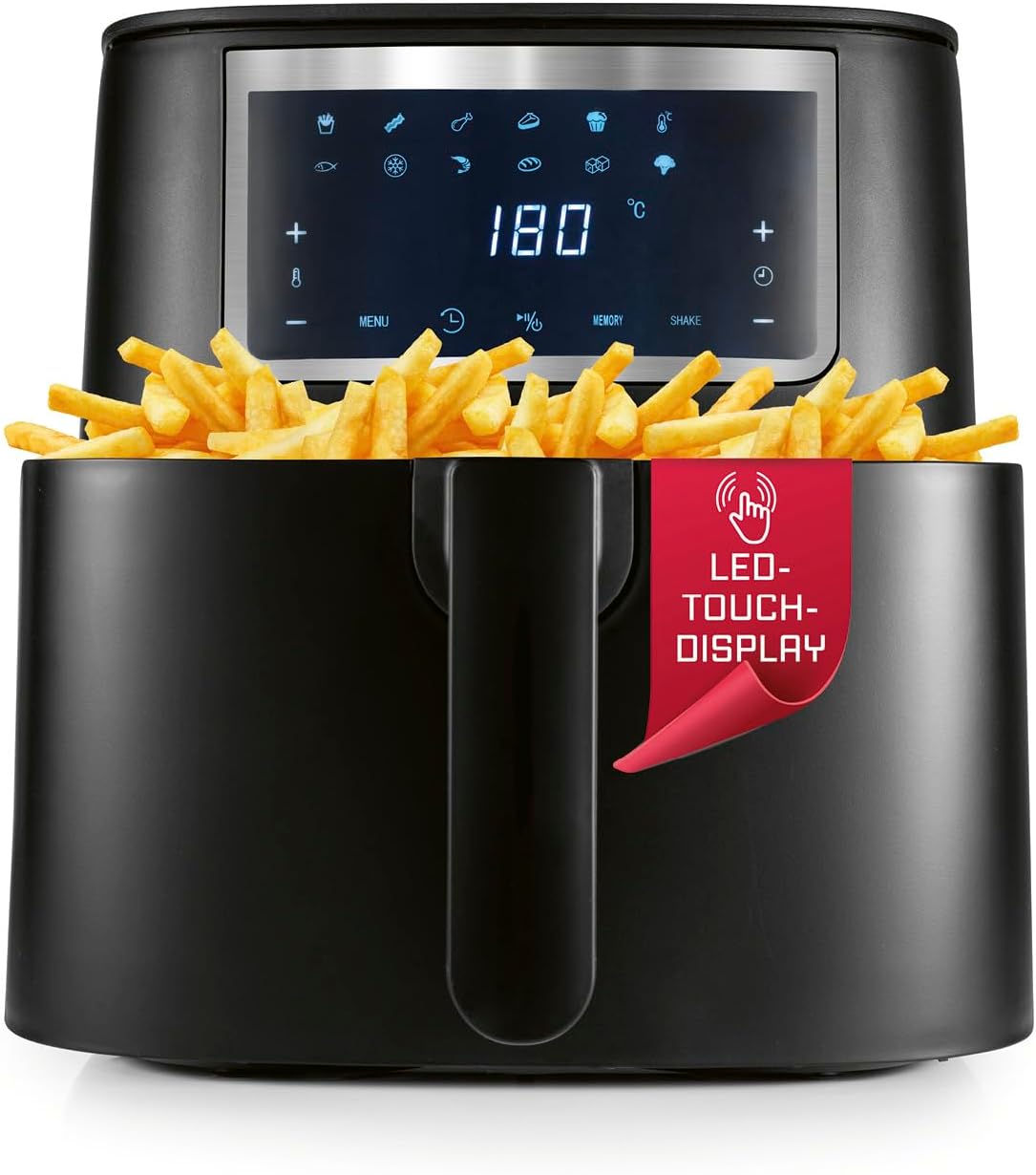 • Пържене с ниско съдържание на мазнини: фритюрникът с горещ въздух GOURMETmaxx с обем 2,3 литра осигурява оптимално разпределение на топлината благодарение на 1000 W и интелигентна 360° циркулация на въздуха. Така получавате хрупкави отвън и красиво сочни резултати отвътре - нежно приготвени и с до 80% по-малко мазнини от конвенционалните фритюрници.