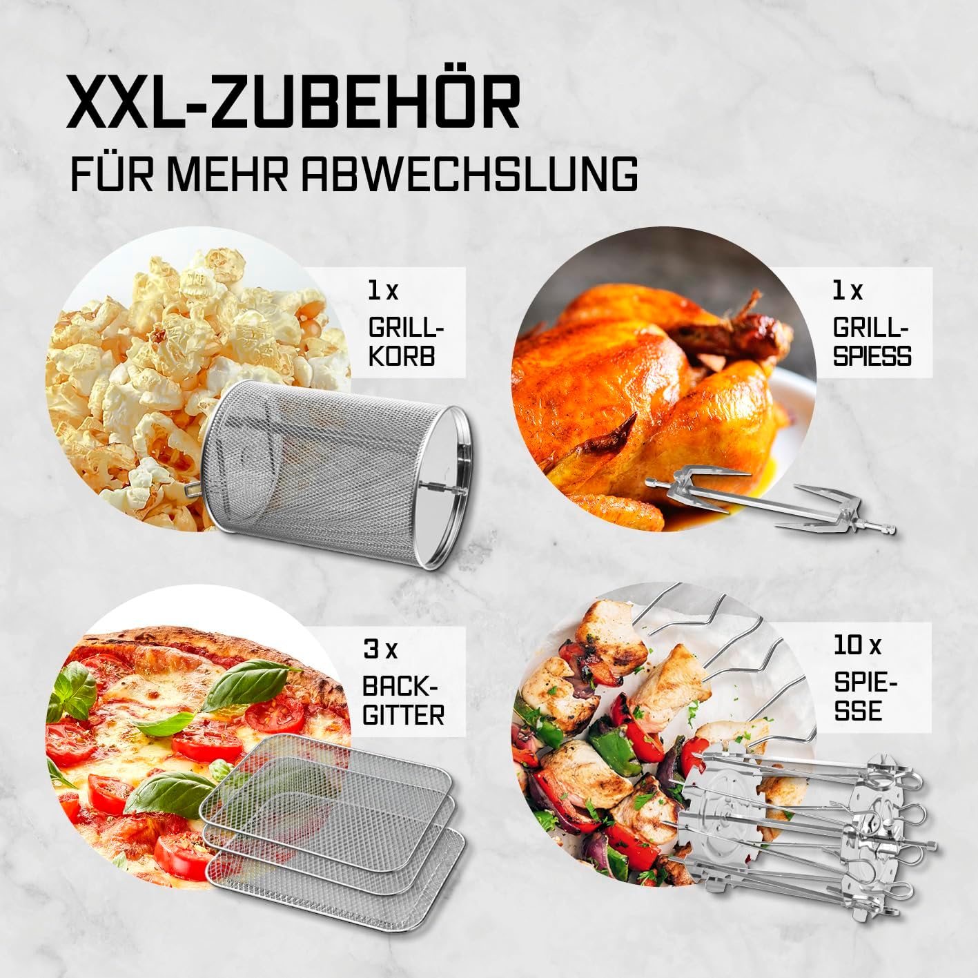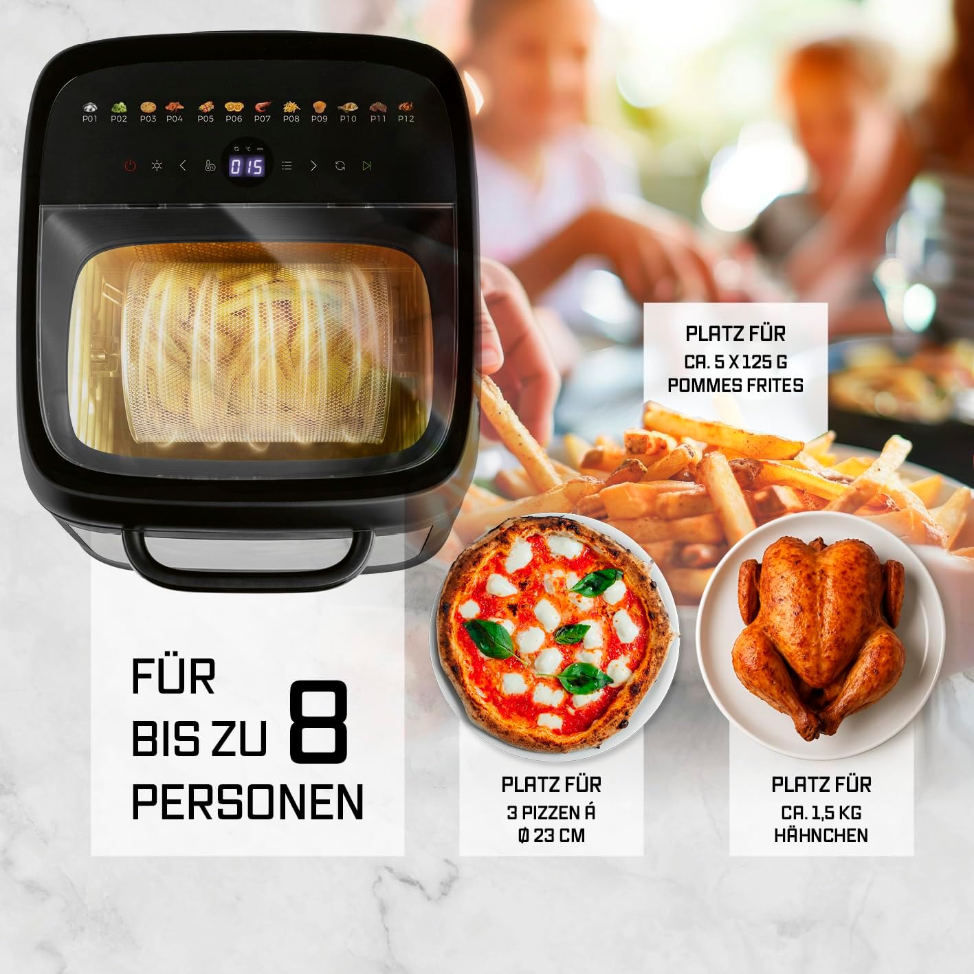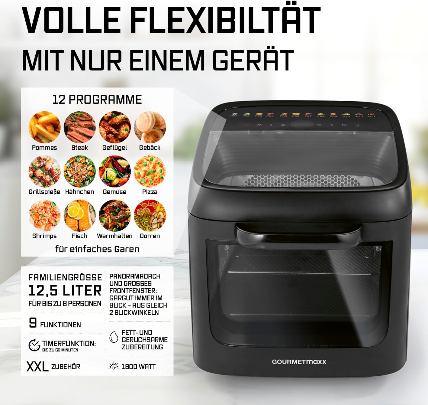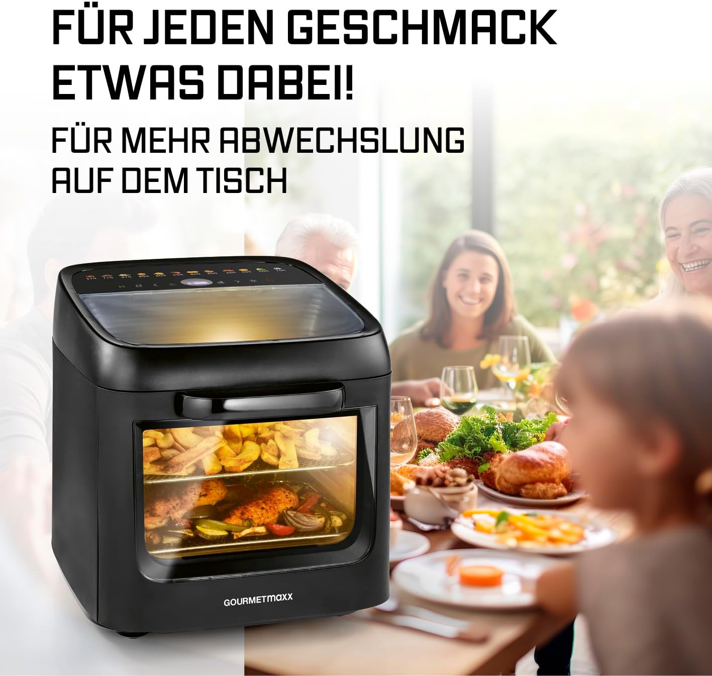 Фурна с горещ въздух GOURMETmaxx с панорамен покрив и преден прозорец 12,5 л | Фритюрник с горещ въздух с 9 функции | Фритюрник с горещ въздух и мини фурна в 1 | за макс. 8 души | Фритюрник с горещ въздух с цветни икони