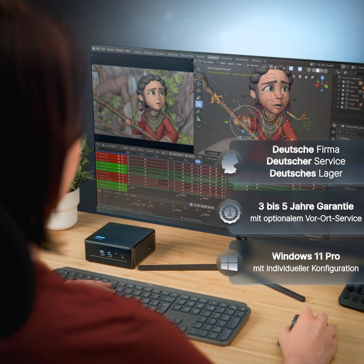 • БЪРЗ, СИГУРЕН И ЕФЕКТИВЕН – С двубандова гигабитова LAN мрежа (2,5 GB/s) и Intel WiFi 6E AX 211, FutureNUC Intel Mini PC предлага най-новата безжична свързаност, осигуряваща бърза и стабилна интернет производителност за сърфиране, стрийминг или игри. FutureNUC Pro се предлага с Microsoft Windows 11 Pro. Малкият мини компютър е оборудван с графика Intel Iris Xe и предлага зашеметяваща 4K UHD резолюция на до четири дисплея.