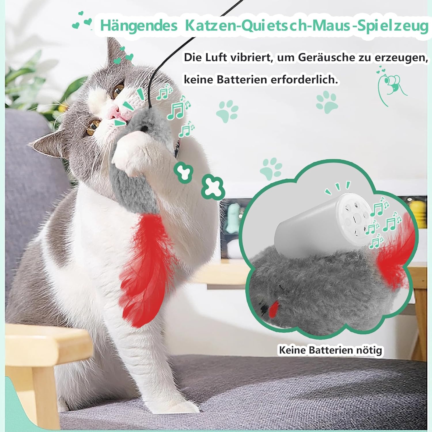 • РЕГУЛИРУЕМО ЕЛАСТИЧНО ВЪЖЕ Еластичното въже може да се регулира на желаната височина, което позволява мишката да бъде дърпана от котката, без тя лесно да се хваща. Когато котката хване и пусне, мишката хвърчи напред-назад и скърца, добавяйки елемент на непредсказуемост и вълнение към играта.