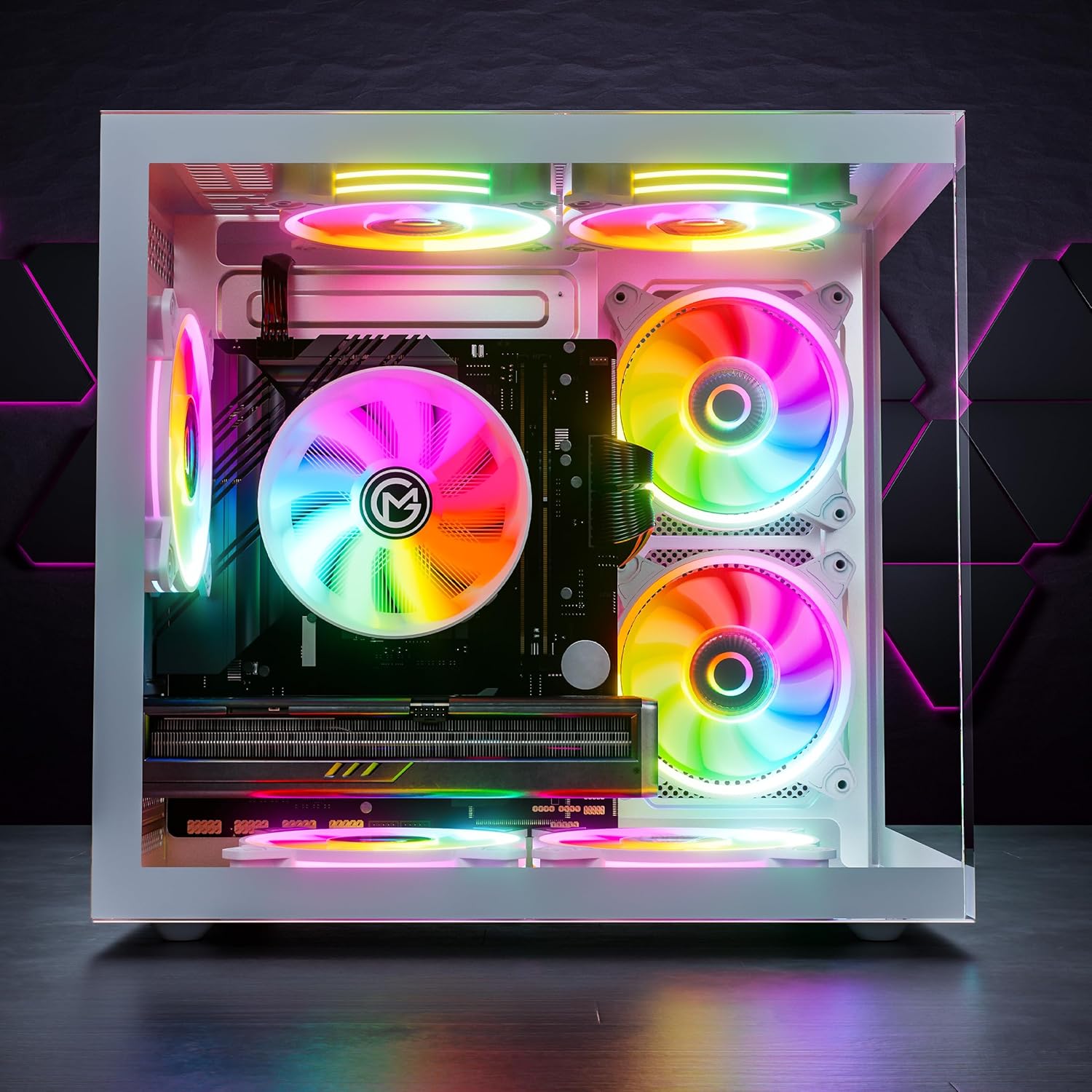Геймърският компютър Trinity е първият избор, ако не искате да правите компромис с добрия външен вид, опциите за персонализиране и производителността на новия си компютър. Елегантен преден панел от тъмно огледално стъкло и четири RGB вентилатора осигуряват фантастично навлизане в света на висок клас игрите. Компютърът разполага и със страничен панел от стъкло по цялата дължина, който разкрива RGB системата за въздушно охлаждане.