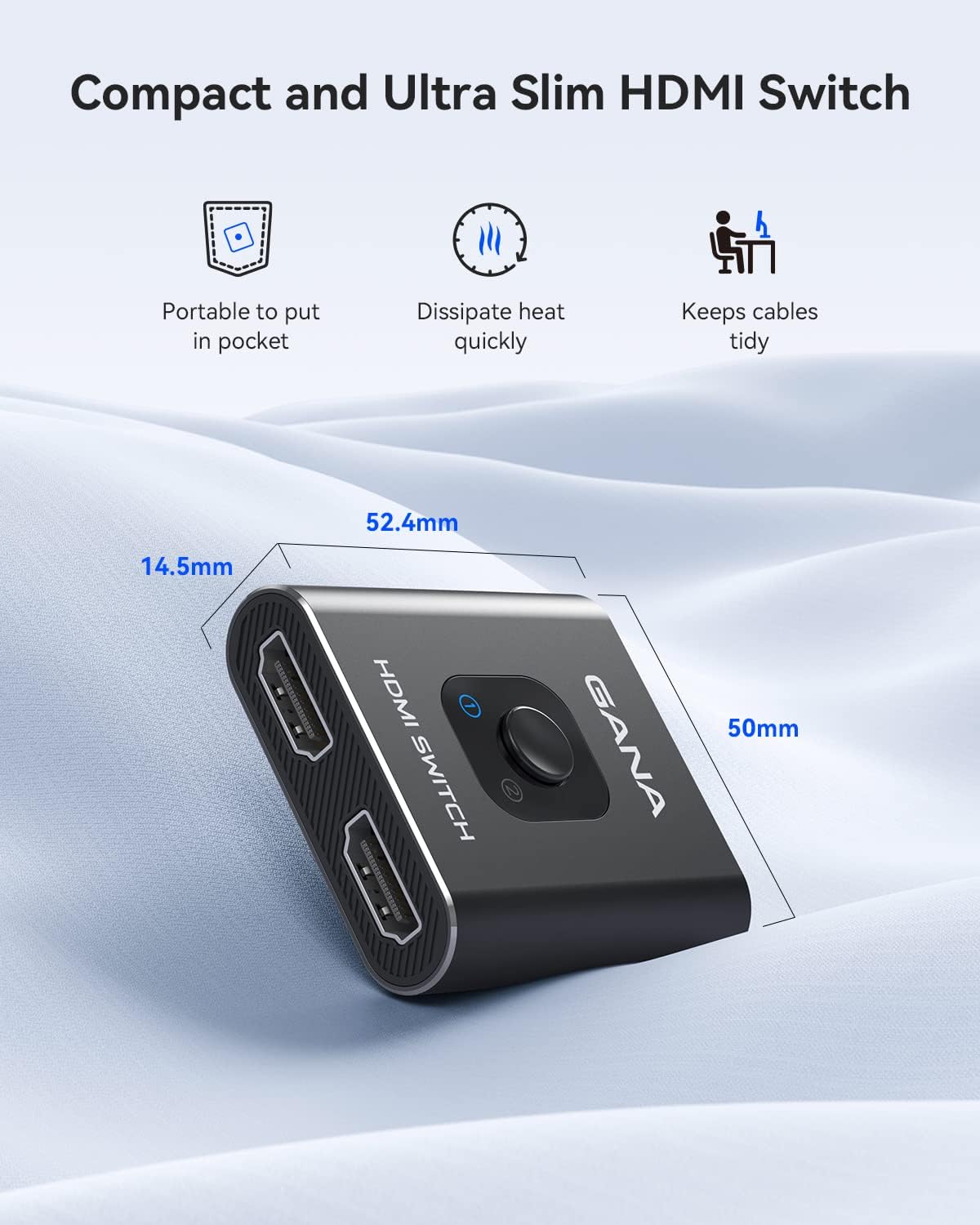 • Нов двупосочен HDMI превключвател Gana, изработен от метал. Можете да свържете два HDMI източника към един HDMI дисплей или да свържете един HDMI източник, за да превключвате между двата дисплея. (Моля, обърнете внимание: 2 дисплея не могат да бъдат показвани едновременно).