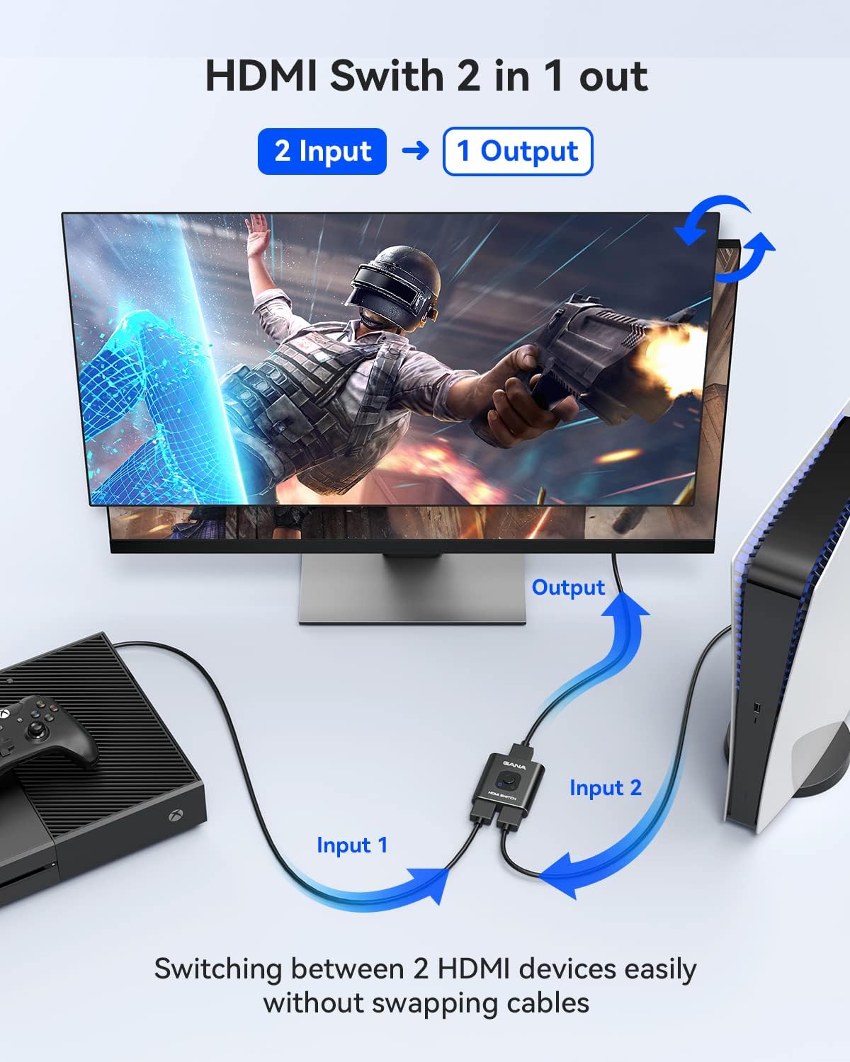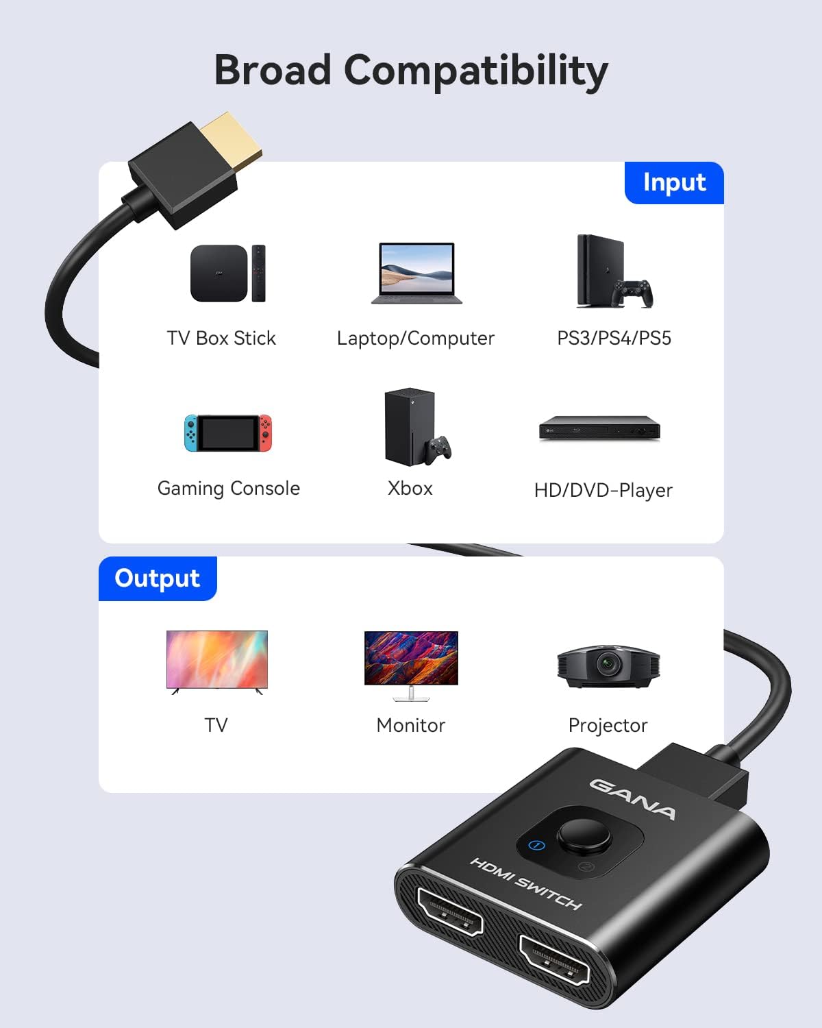 GANA HDMI сплитер 4K 60Hz 2 входа 1 изходен превключвател с 1 м кабел, алуминиев корпус, HDCP2.2 UHD 3D за PS5/4, Xbox, Blu-Ray DVD, Fire TV Stick, Chromecast, монитори