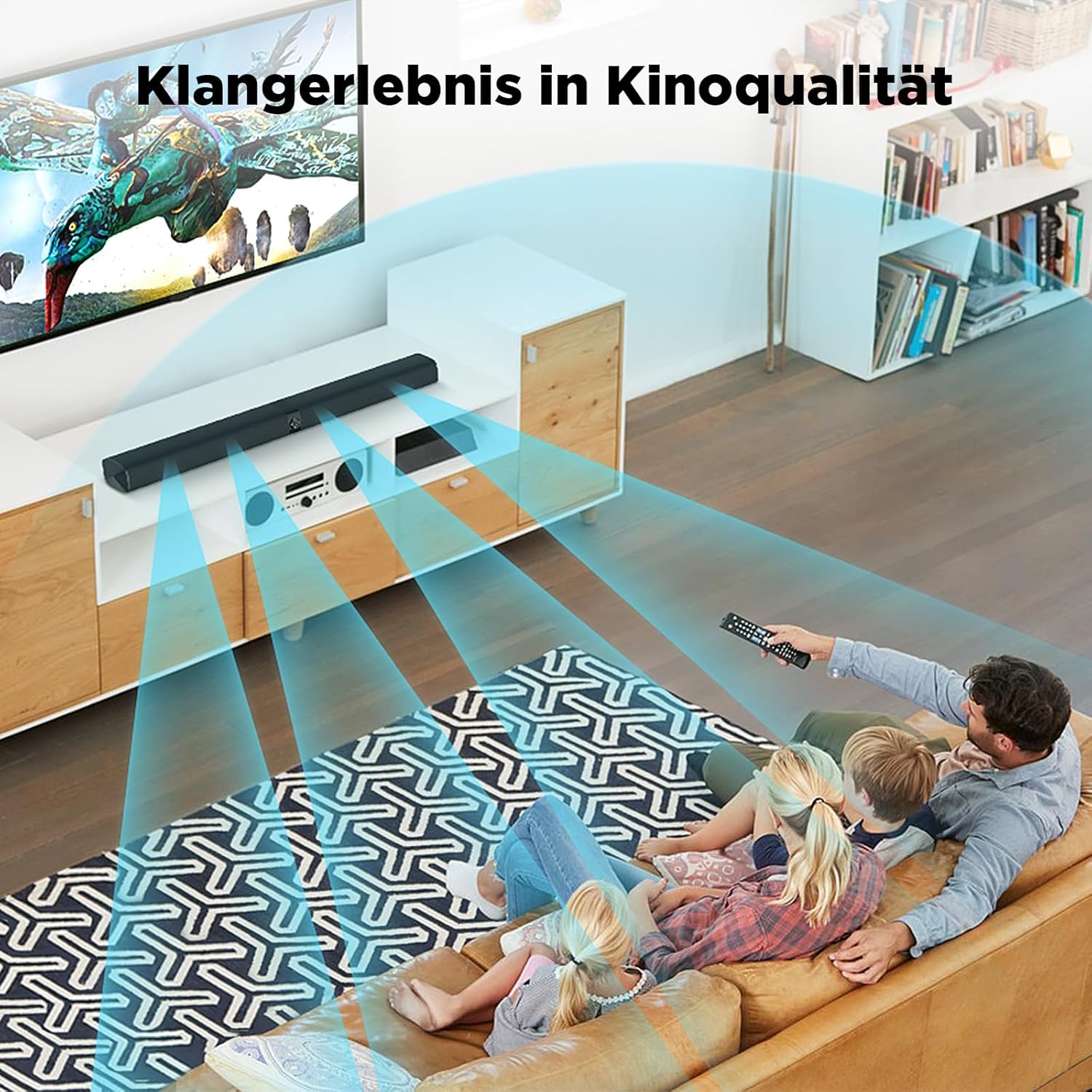 • ЛЕСНА НАСТРОЙКА И СВЪРЗАНОСТ Инсталирането на нашия Bluetooth саундбар е лесно и предлага съвместимост с оптични/HDMI/AUX/Bluetooth връзки за различни устройства, включително надеждната опция Bluetooth 5.3. Нашият саундбар за телевизор се предлага с подробни, илюстрирани инструкции, полезни видео уроци и всички необходими аксесоари за монтаж, за да се опрости процесът на настройка.
