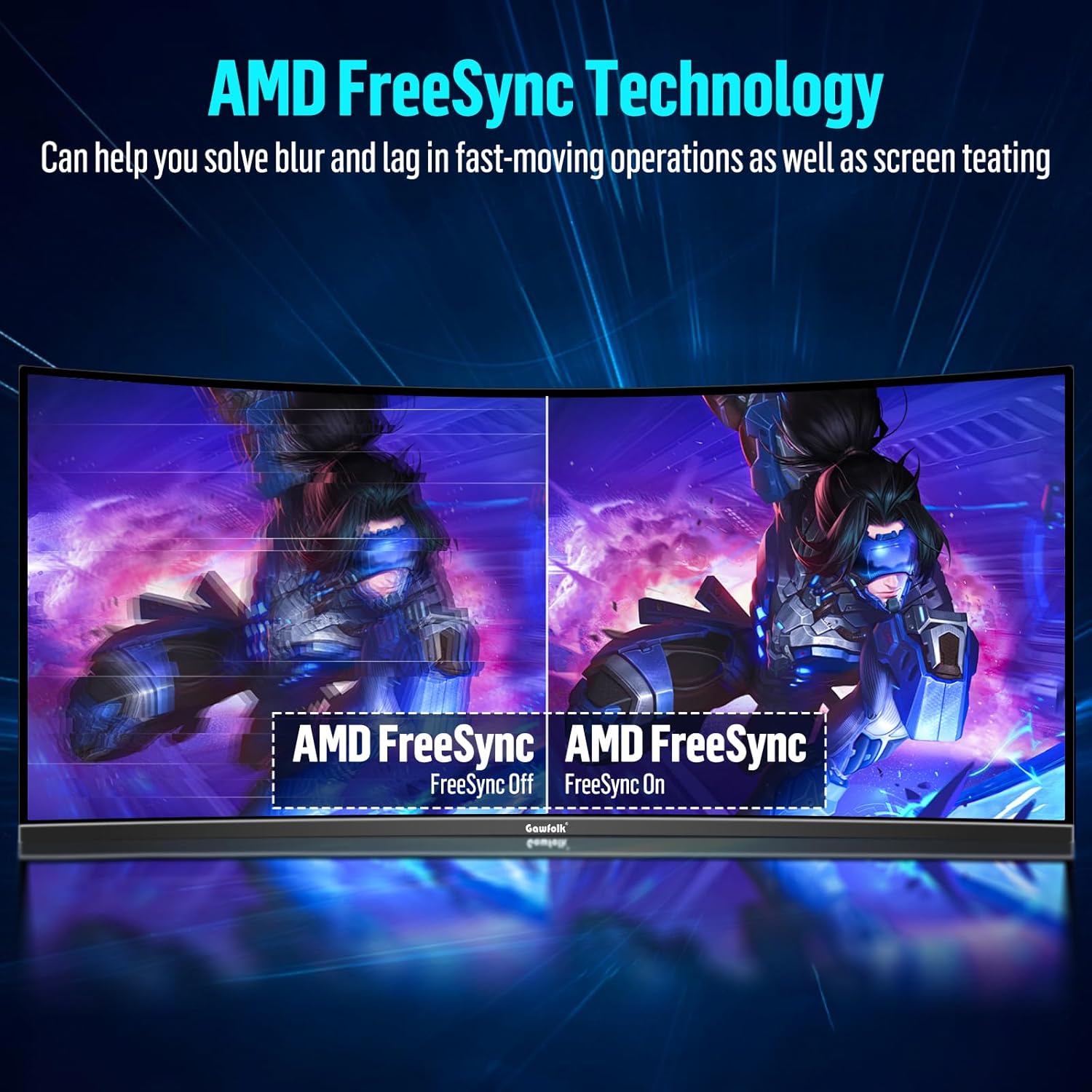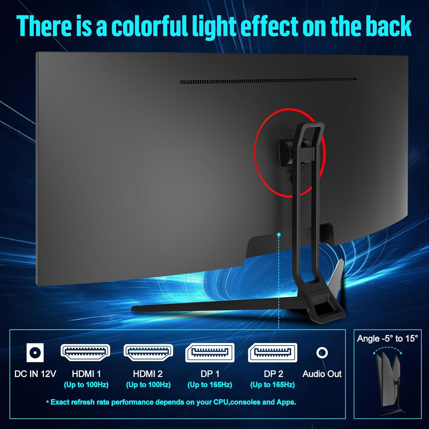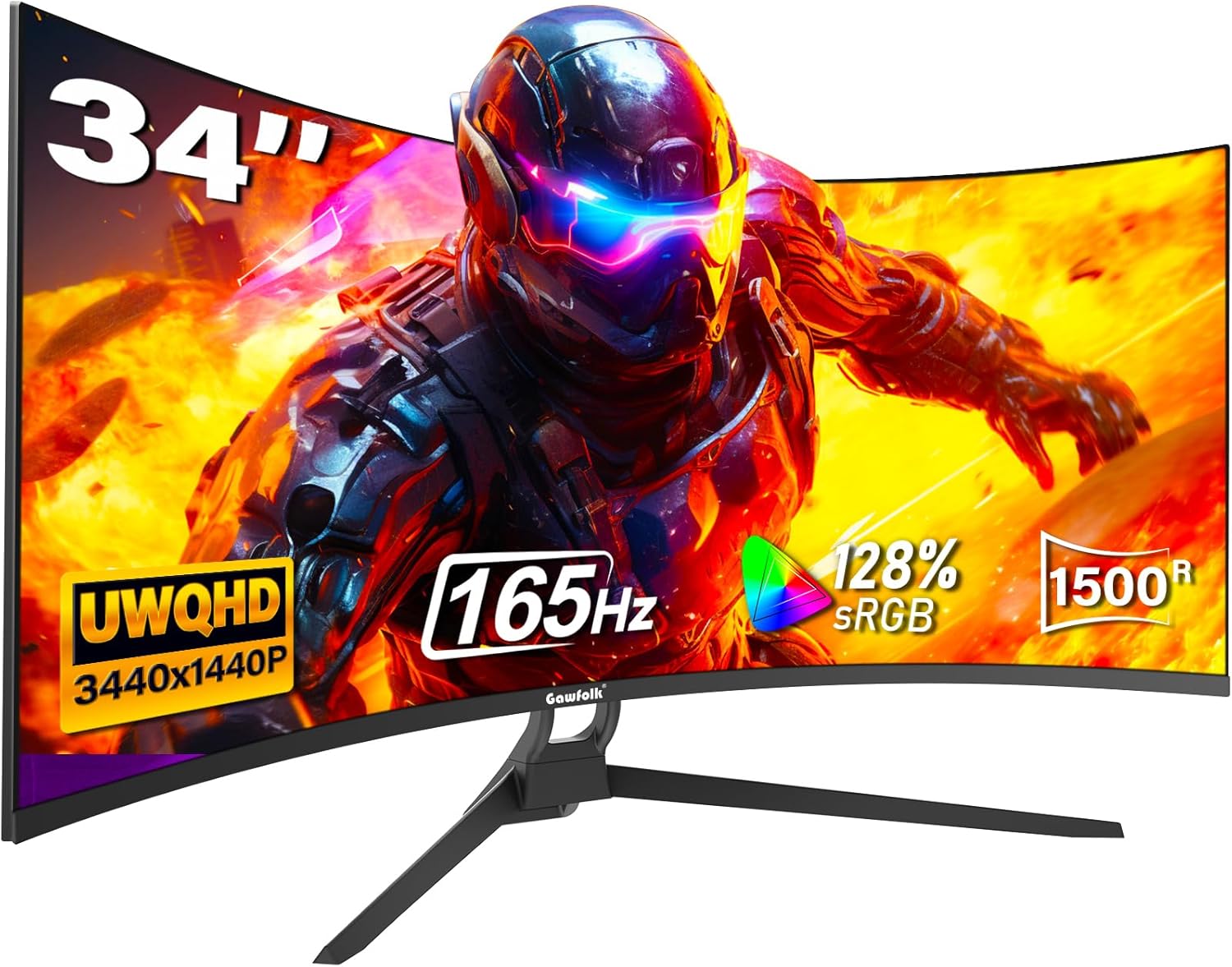 Gawfolk геймърски извит монитор 34 инча 165 Hz, 1500R ултраширок екран за компютър UWQHD 3440 x 1440P, извит компютърен екран, VA, DisplayPort, HDMI, VESA 75 x 75 мм