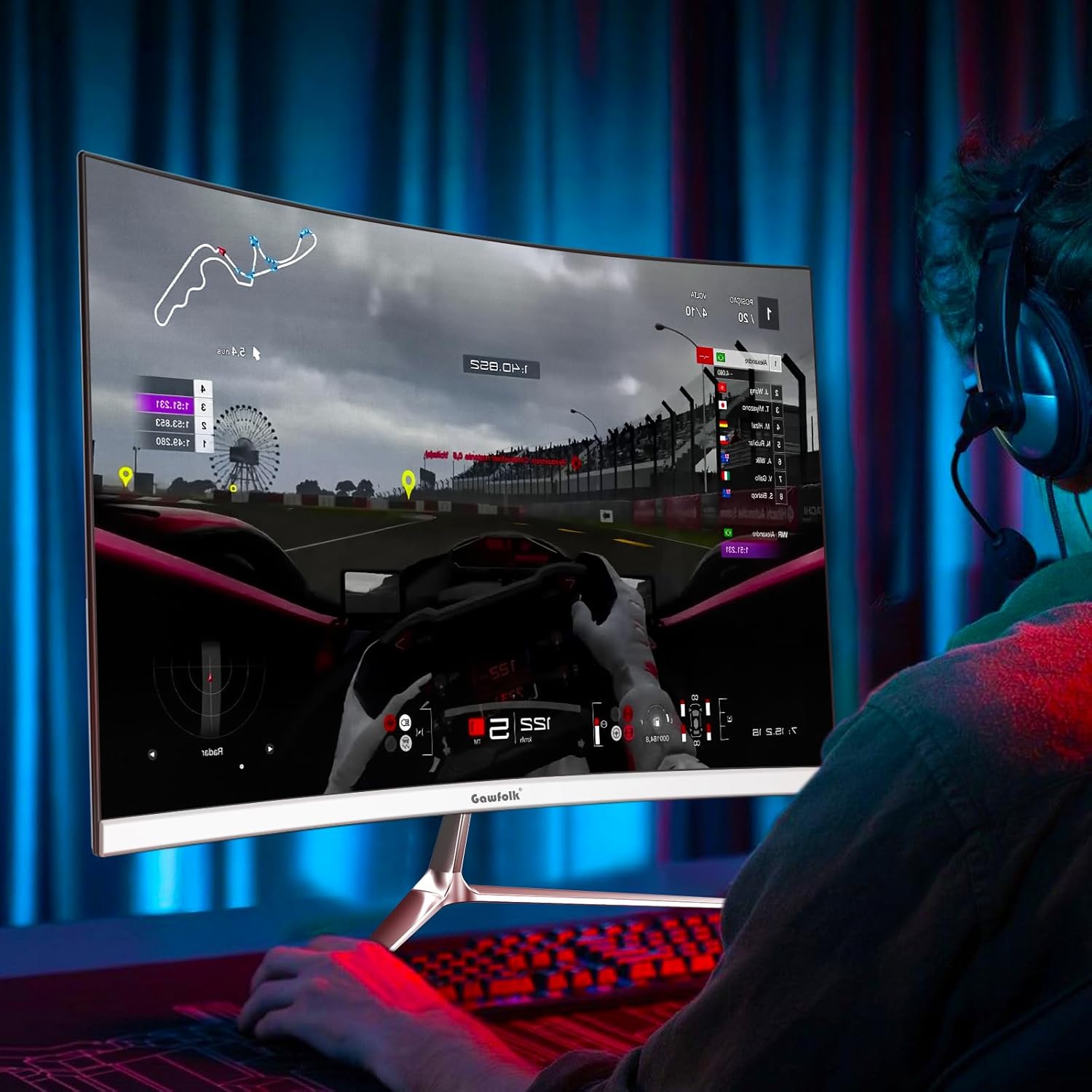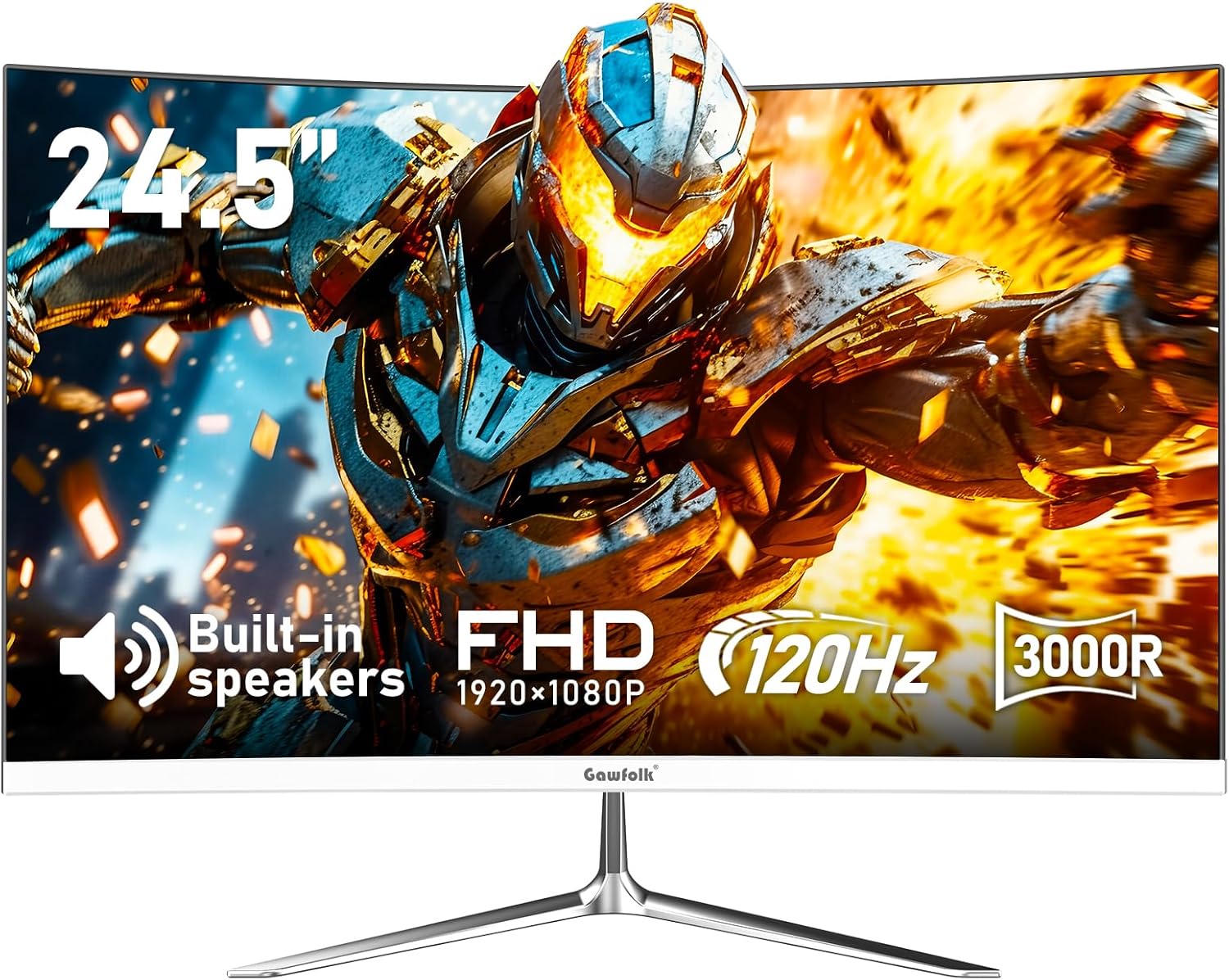 Gawfolk извит монитор 24.5 инча 120Hz с високоговорител, 3000R извит компютърен екран FHD 1080P, бял компютърен монитор с технология за грижа за очите HDMI VGA, поддържа VESA