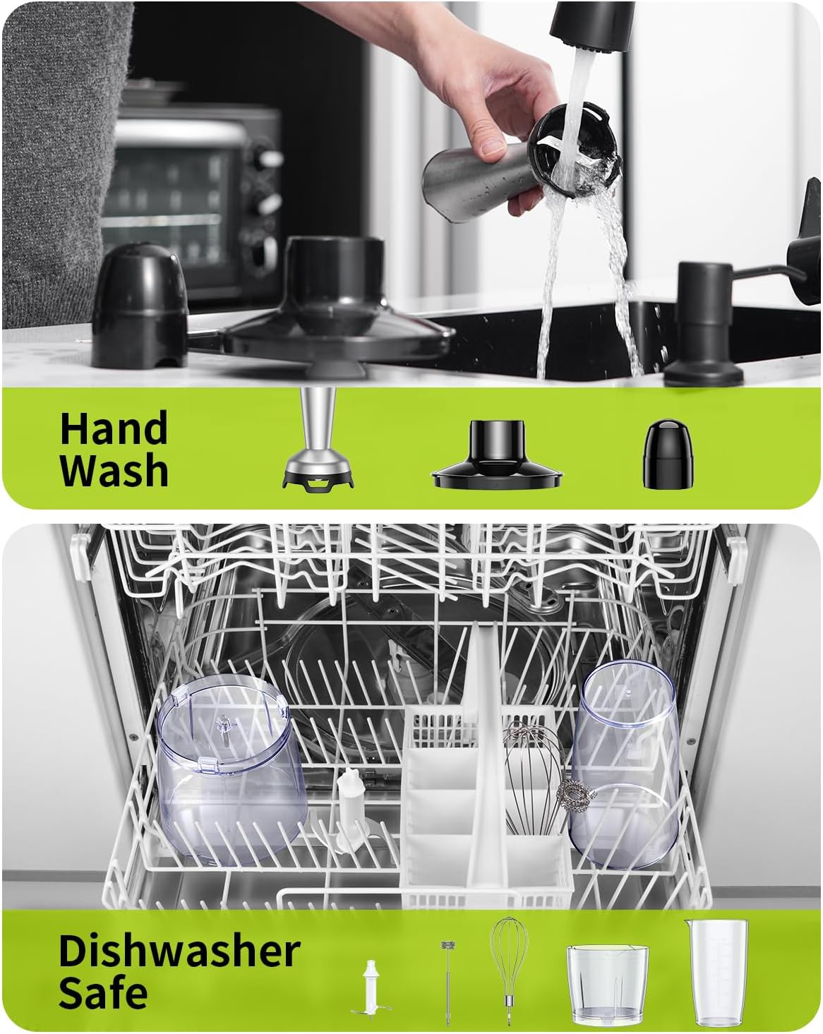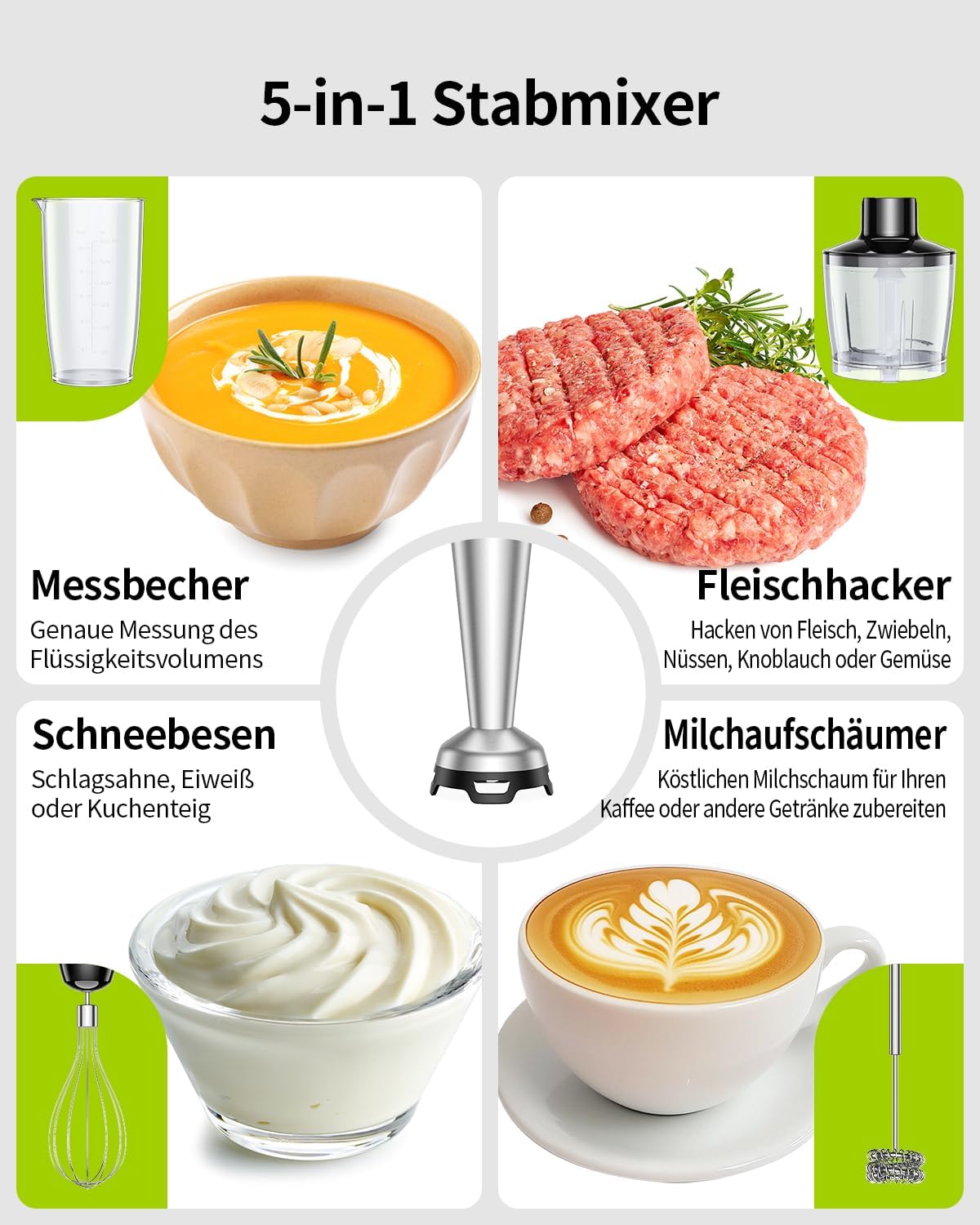 • 【Многофункционален ръчен блендер 5 в 1】: включва пръчка за пюре, бъркалка, пръчка за разпенване на мляко, мерителна чаша 800 мл и чопър 600 мл. Можете да го използвате за приготвяне на смутита, супи, сосове, пюрета и други. Може да се използва и за лесно нарязване на ядки и месо.