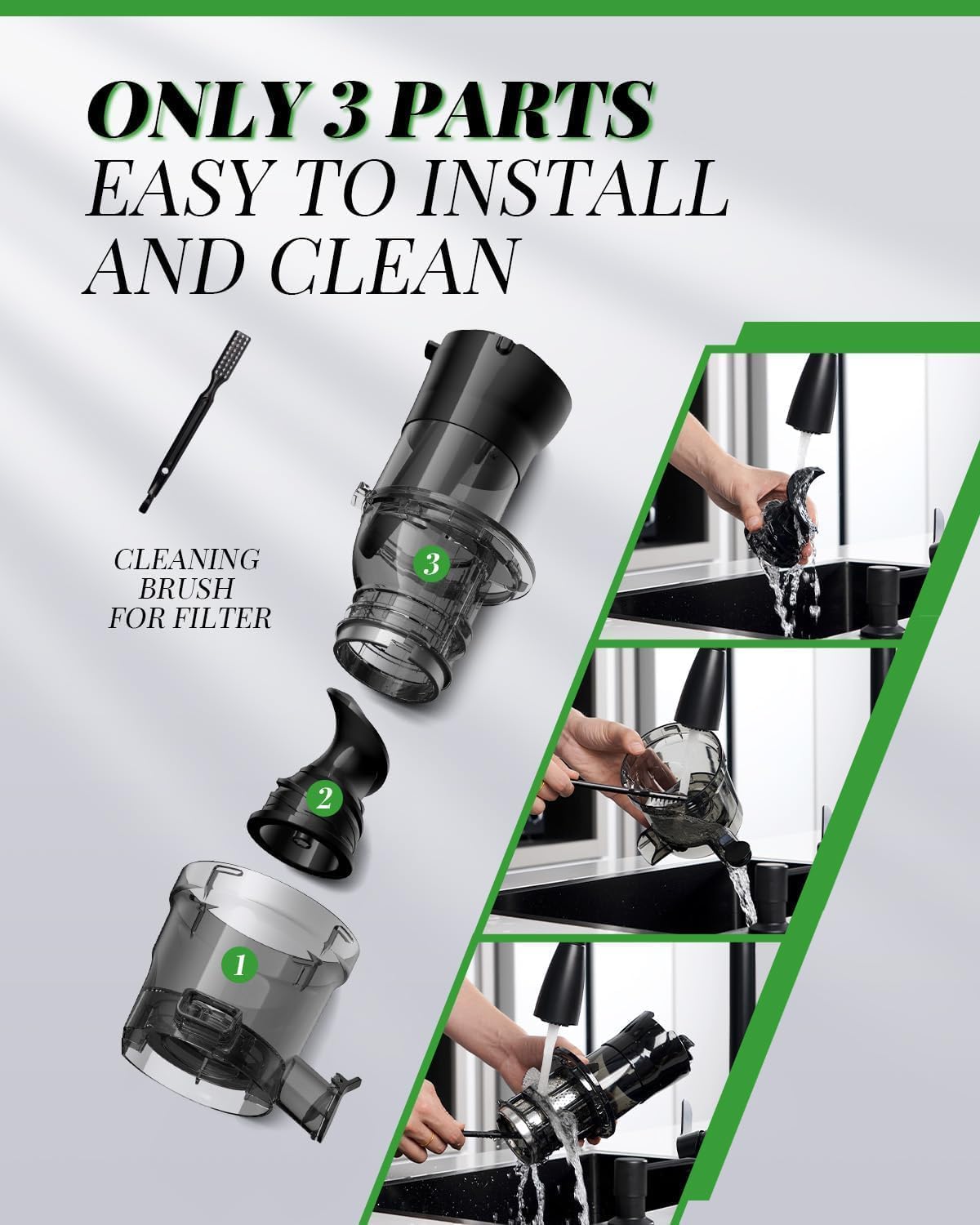 • Лесна за почистване и употреба: сокоизстисквачката може лесно да се сглоби и почисти само с три подвижни части. Включената четка за почистване помага с това. Запушване? Няма проблем - просто натиснете бутона за обратно въртене и продължете да изцеждате сока!