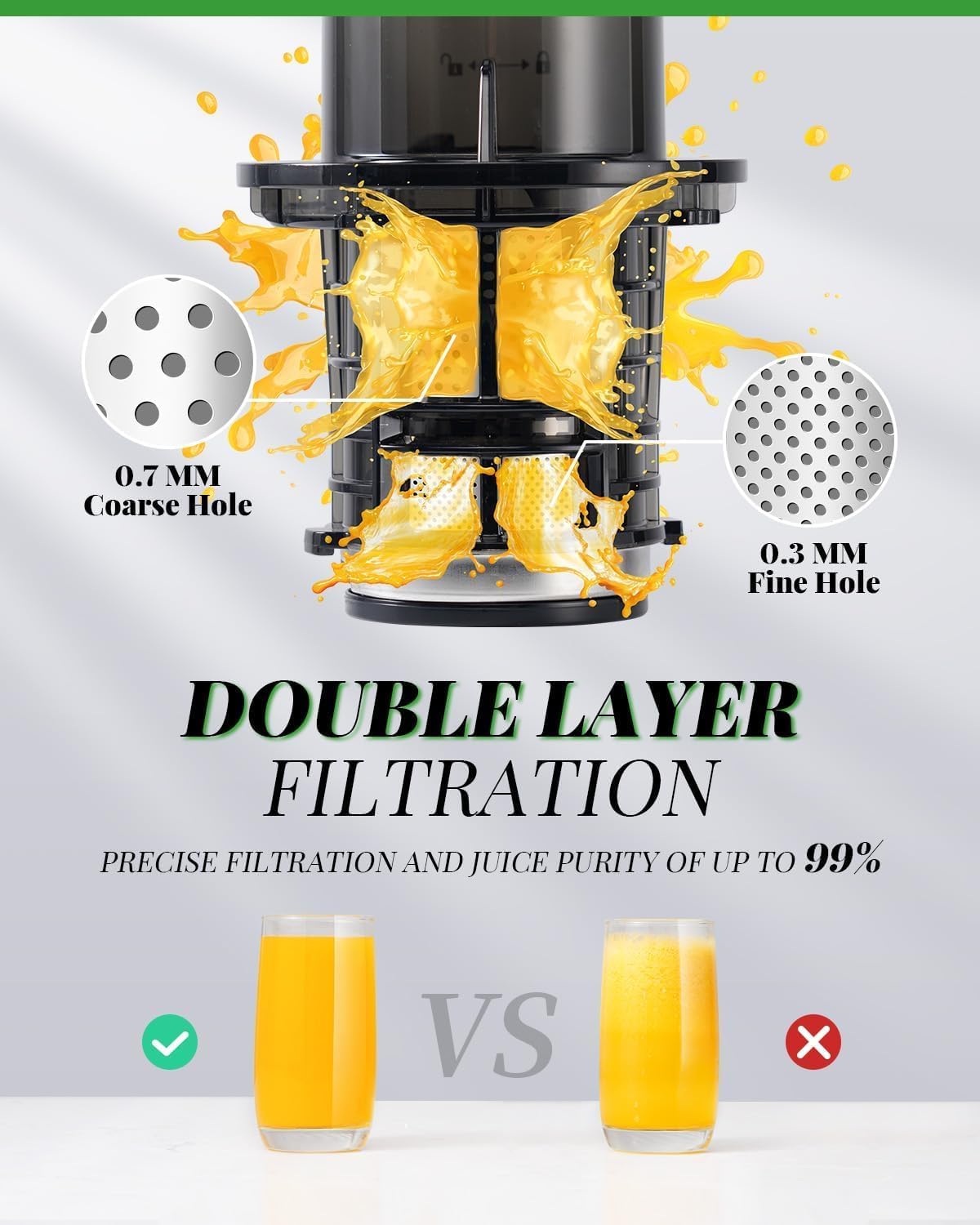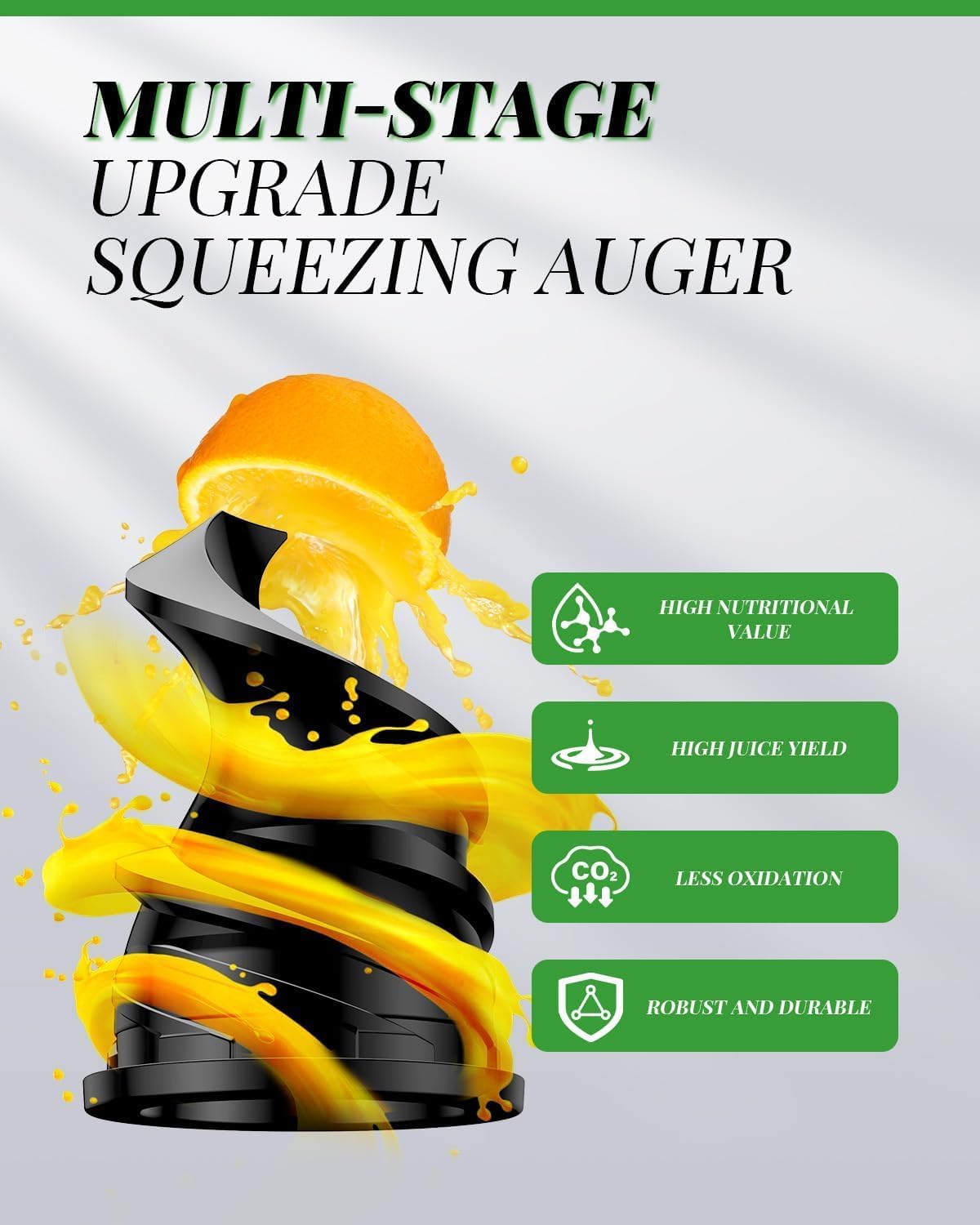 • Тиха работа под 60 dB: В сравнение с центробежните сокоизстисквачки, бавните сокоизстисквачки са оборудвани с тихи DC двигатели, така че можете да се насладите на тихо време за изцеждане на сок с шум под 60 dB по време на работа, без да безпокоите семейството и съседите си. Идеални за сутрешна рутина.