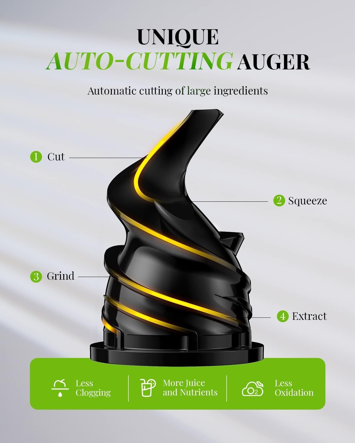 • [Ефективно извличане на сок]: Бавните сокоизстисквачки извличат сок чрез бавно изстискване на плодове и зеленчуци, което води до максимален добив на сок. Цялостният процес на извличане води до по-малко пулпа и отпадъци и максимизира използването на съставките. Запазват се повече хранителни вещества и витамини в сока, което води до по-здравословен, по-свеж вкус и по-богат на хранителни вещества сок.