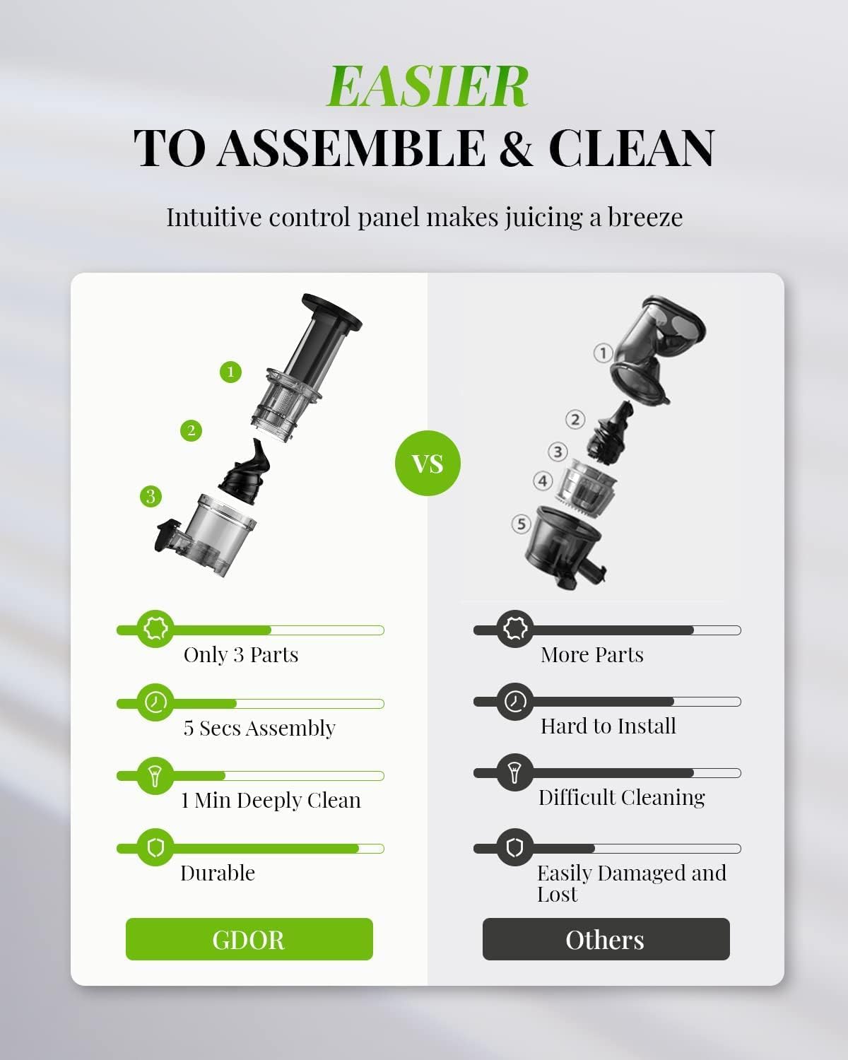 GDOR Компактна сокоизстисквачка Мощна бавна сокоизстисквачка Лесна за почистване Сокоизстисквачка за зеленчуци и плодове с ниско ниво на шум, висок добив на сок, 600 мл, включена четка, без BPA
