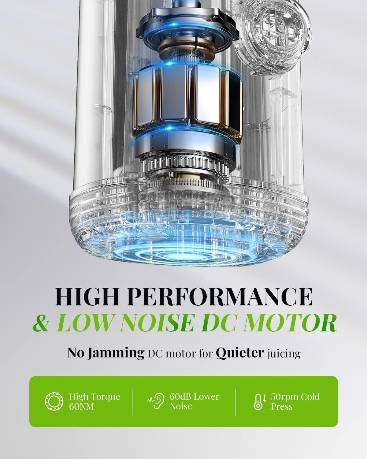 • [По-висока чистота на сока]: Дъвчащата сокоизстисквачка с технология за двойно филтриране произвежда сокове с чистота до 97%. Това води до чист сок с по-гладка текстура, без частици от пулпа и пяна, което прави сока по-вкусен.