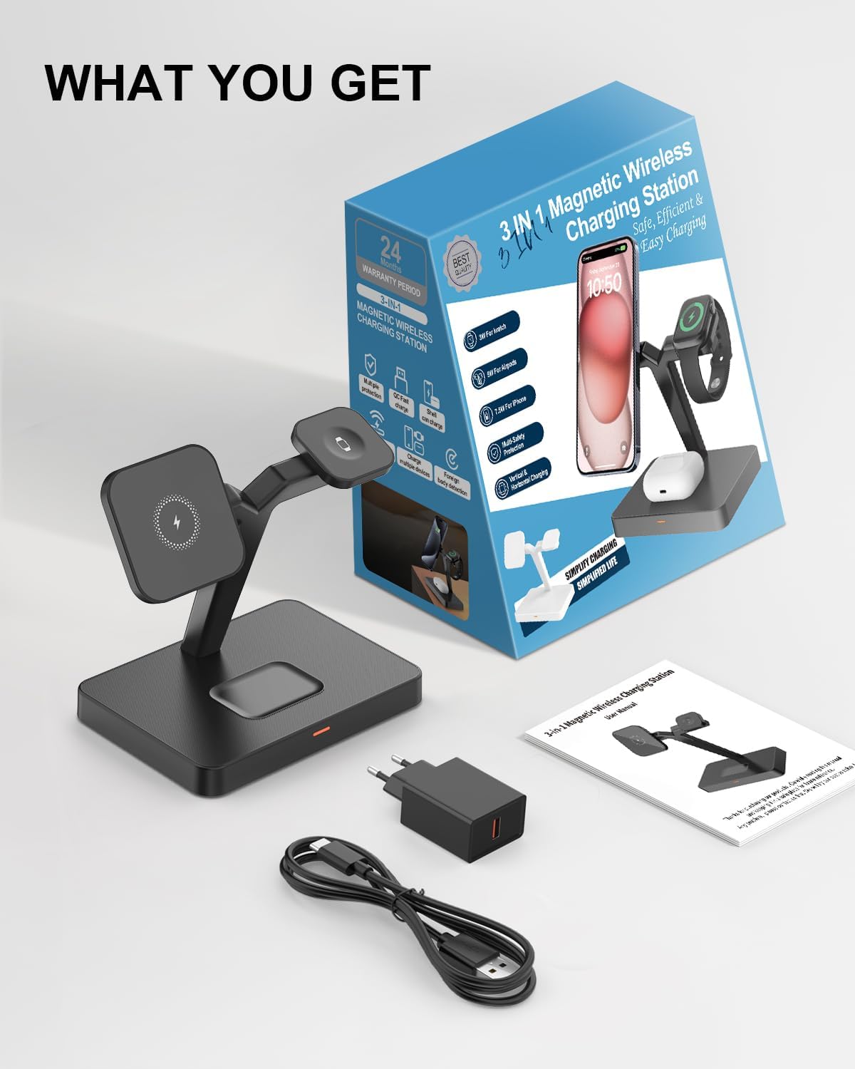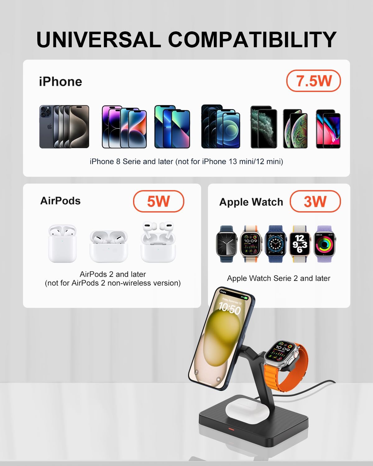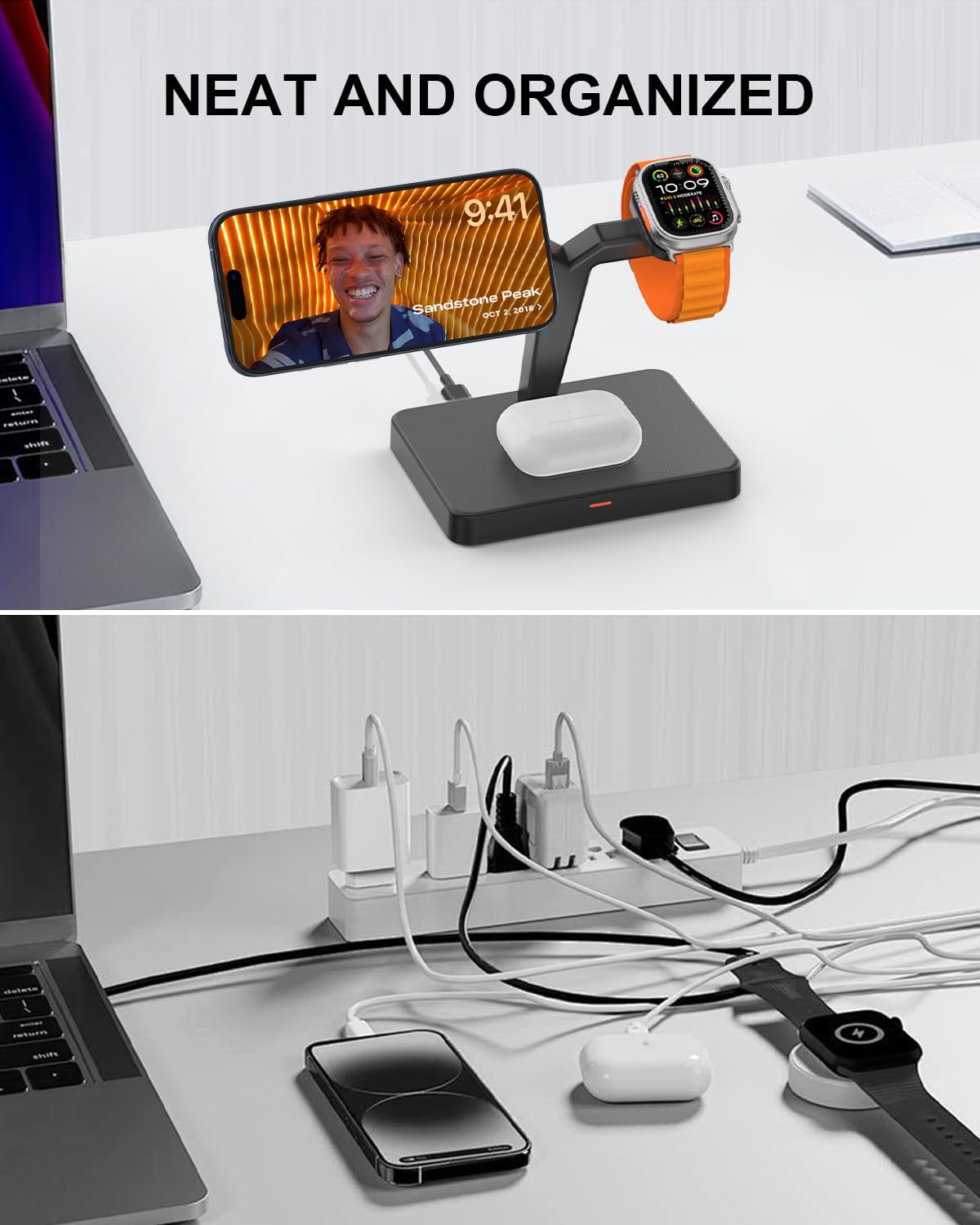 Търсите ли удобно и високоефективно зарядно устройство, с което да зареждате едновременно вашия iPhone, Apple Watch и Airpods? Не търсете повече от зарядната станция Geekera 3-в-1 на Apple. Тя е преминала официалното WPC оторизиране чрез споразумение за безжично зареждане QI и ви предлага висококачествено безжично зареждане (Забележка: Qi регистрационният идентификатор е 12220).