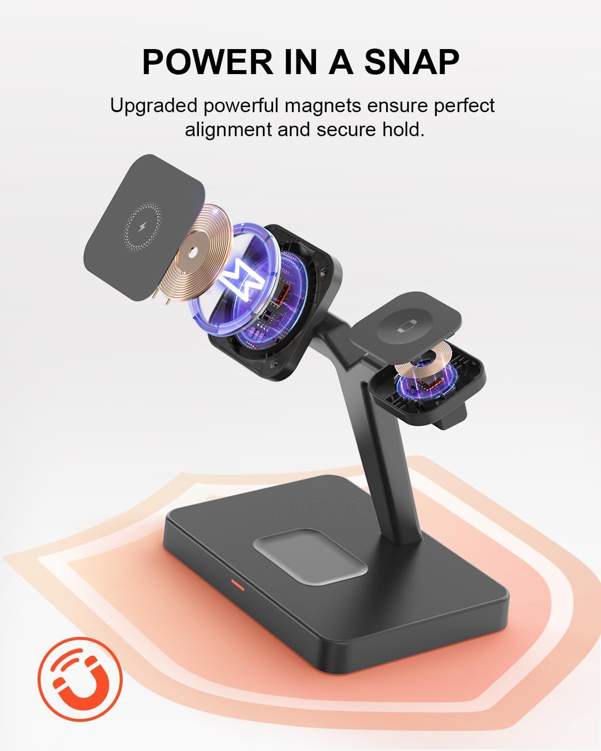 2. Подобрено бързо зареждане Проектирана с 4 Powerwave бобини за бързо предаване на електромагнитна енергия, тази безжична зарядна стойка може да зареди напълно вашия iPhone 14 за около 2,5 часа, което е почти 30% по-бързо от другите зарядни устройства за iPhone.