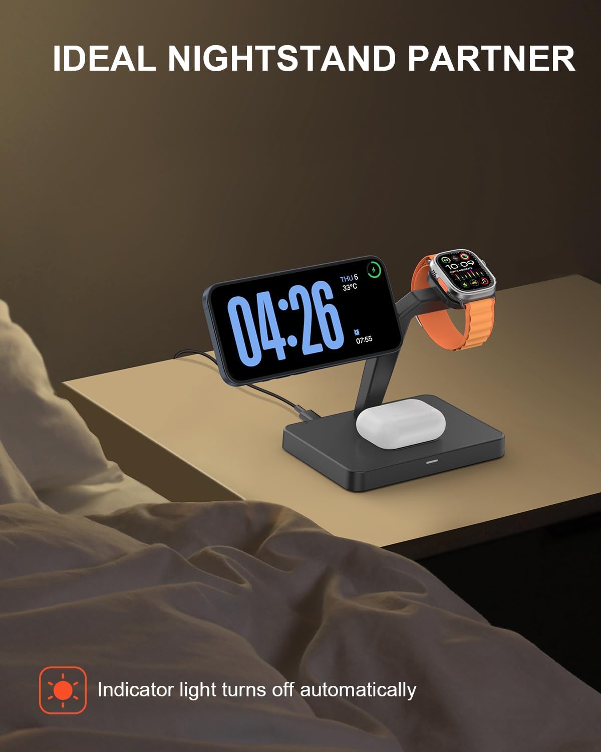 The indicator light of the iPhone charging station flashes when a power source is connected. Simply place the devices on the wireless charging pad to start charging. The corresponding light lights up and then turns off automatically within 20 seconds.