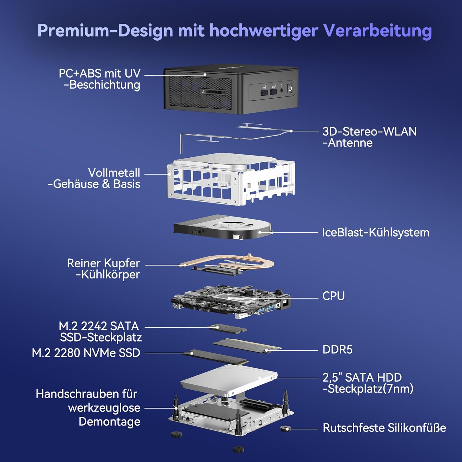 • [Поддържа до 128GB RAM + 8TB SSD капацитет за съхранение] IT15 е оборудван с 32GB DDR5-5600MHz RAM (двуканална, разширяема до 128GB) и 2TB M.2 2280 PCIe Gen4 NVMe SSD (до 4TB). Той също така разполага със слот M.2 2242 SATA (до 2TB) и слот за 2.5" SATA HDD (до 2TB), което го прави перфектно подготвен за бъдещи нужди.