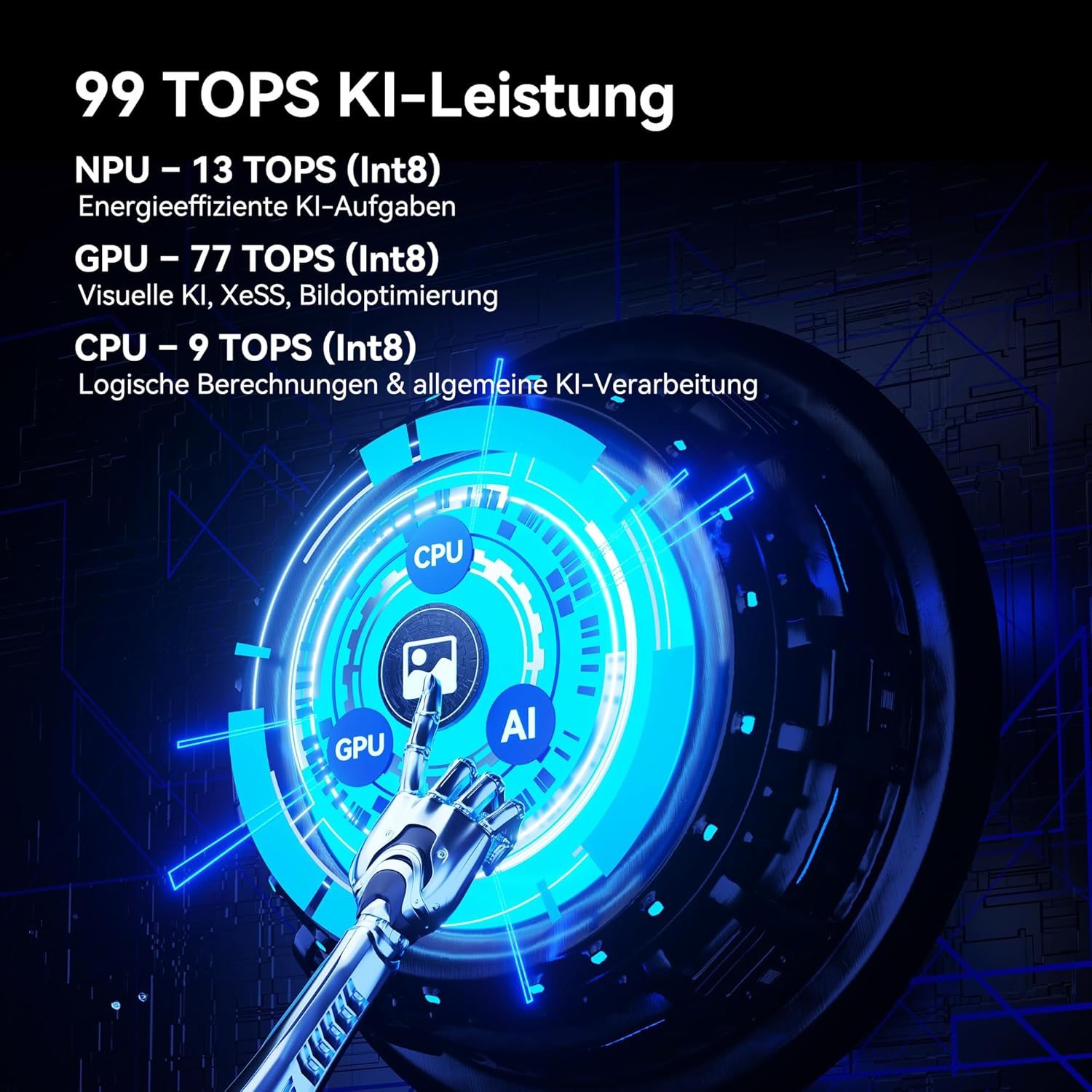 • [AI Revolution] Тройна AI производителност за професионални приложения. IT15 осигурява 99 TOPS изчислителна мощност чрез уникалната си комбинация от NPU, GPU и CPU. Тази производителност позволява AI задачи, като например генериране на стабилни дифузионни изображения само за 1,8 секунди на изображение.