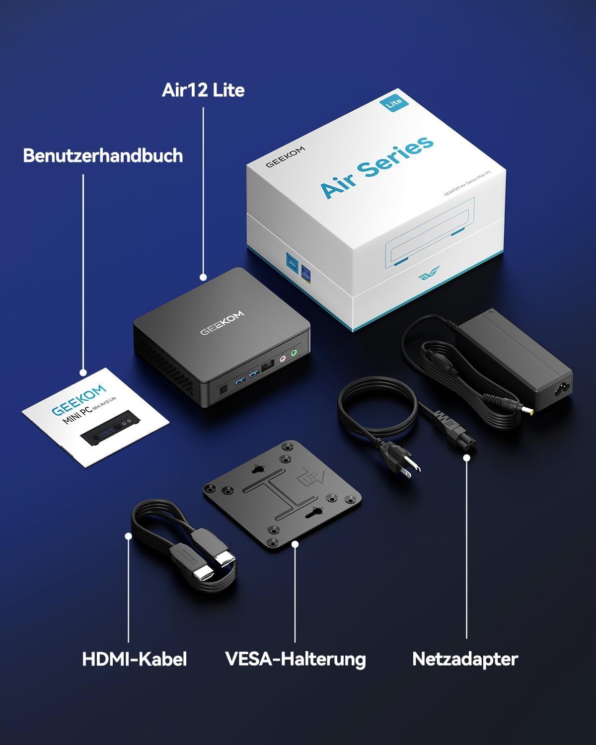 GEEKOM [Стойност за парите] Мини компютър Air12 Lite с Intel N150 (надстройка от N100) Мини компютър, 3 години гаранция, 6×USB/9-PIN портове/Wi-Fi/Двоен дисплей 4K@60Hz/HDMI 2.0 за бизнес офис мултимедия