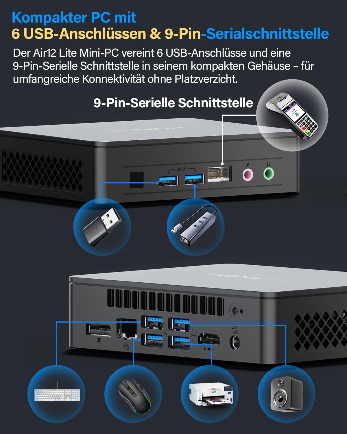 • [9-пинов индустриален конектор] Мини компютърът GEEKOM Air12 Lite разполага с професионален 9-пинов индустриален конектор (RS-232), който може да бъде директно свързан към скенери за баркодове, измервателни уреди и други специализирани устройства - без адаптери, за надеждна индустриална свързаност в търговията на дребно, медицината и производството.