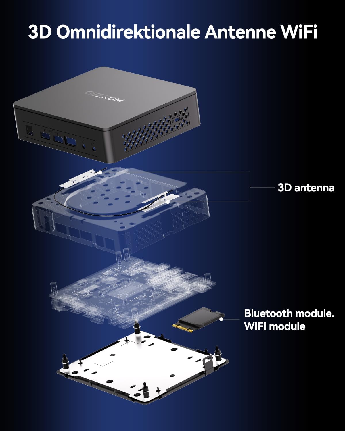 • [Високопроизводителна свързаност] Air12 Lite Micro PC използва 3D антенна технология за до 30% по-добро Wi-Fi приемане, комбинирана с Intel Bluetooth модул за надеждни безжични връзки. Освен това, Gigabit Ethernet портът (RJ45) осигурява стабилност на кабелната връзка в професионална среда. Препоръчваме ви да гледате видеоклиповете на страницата с подробности, за да откриете разликите между GEEKOM Mini PC и други Mini PC!