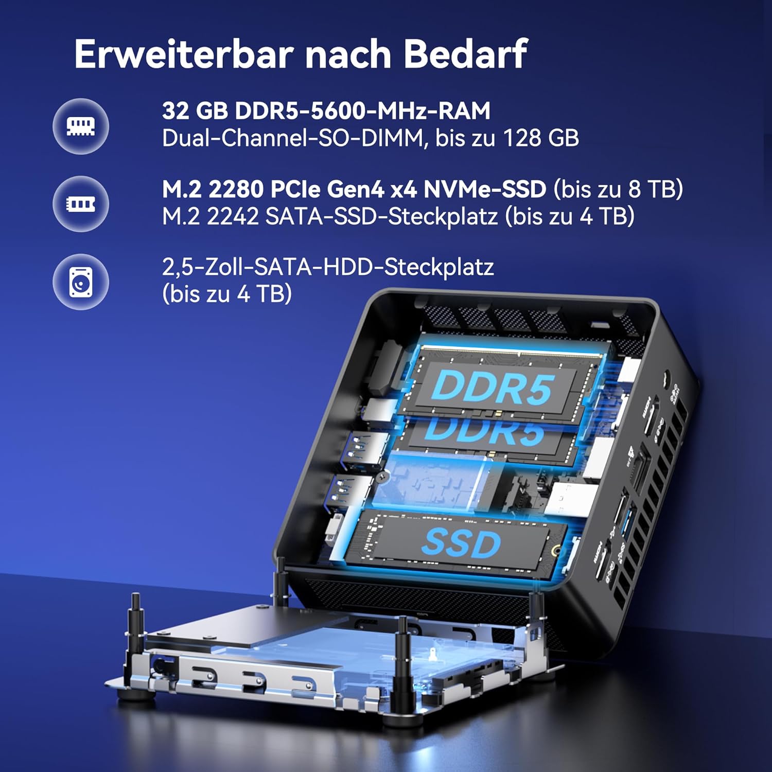 • [Поддържа до 128GB RAM + 8TB SSD капацитет за съхранение] IT15 е оборудван с 32GB DDR5-5600MHz RAM (двуканална, разширяема до 128GB) и 2TB M.2 2280 PCIe Gen4 NVMe SSD (до 4TB). Той също така разполага със слот M.2 2242 SATA (до 2TB) и слот за 2.5" SATA HDD (до 2TB), което го прави перфектно подготвен за бъдещи нужди.