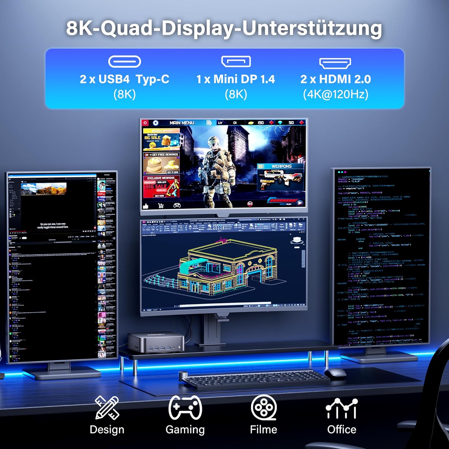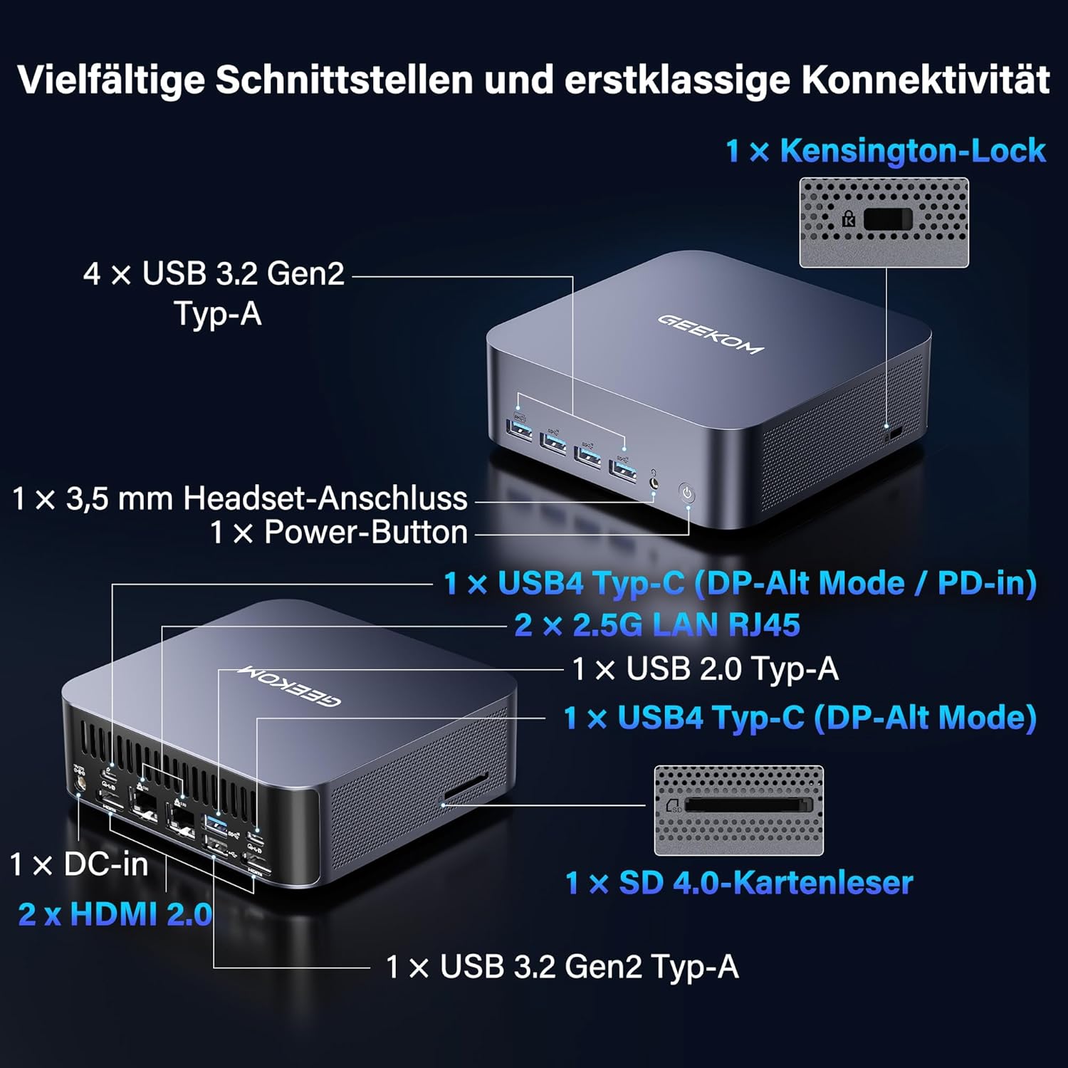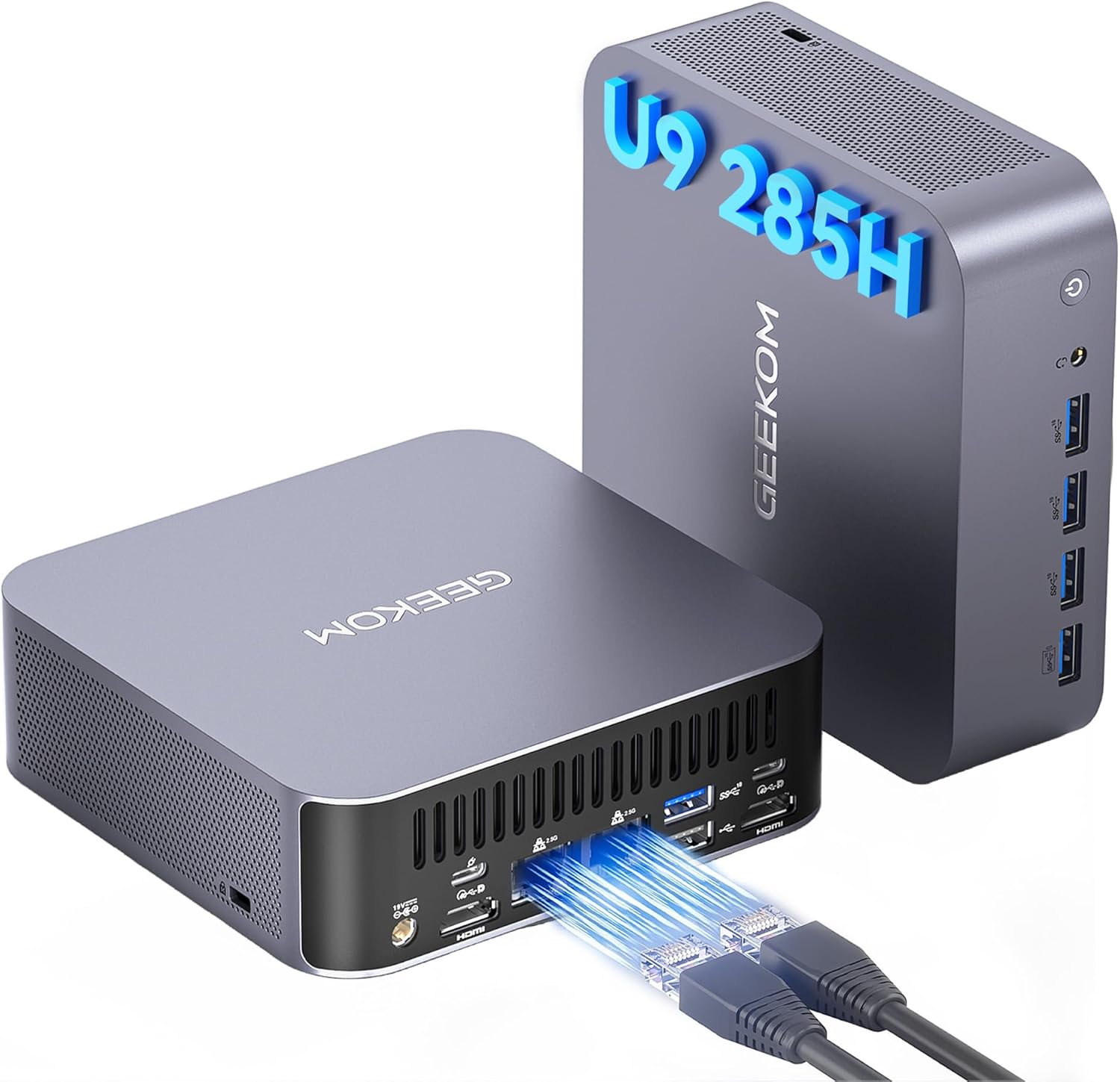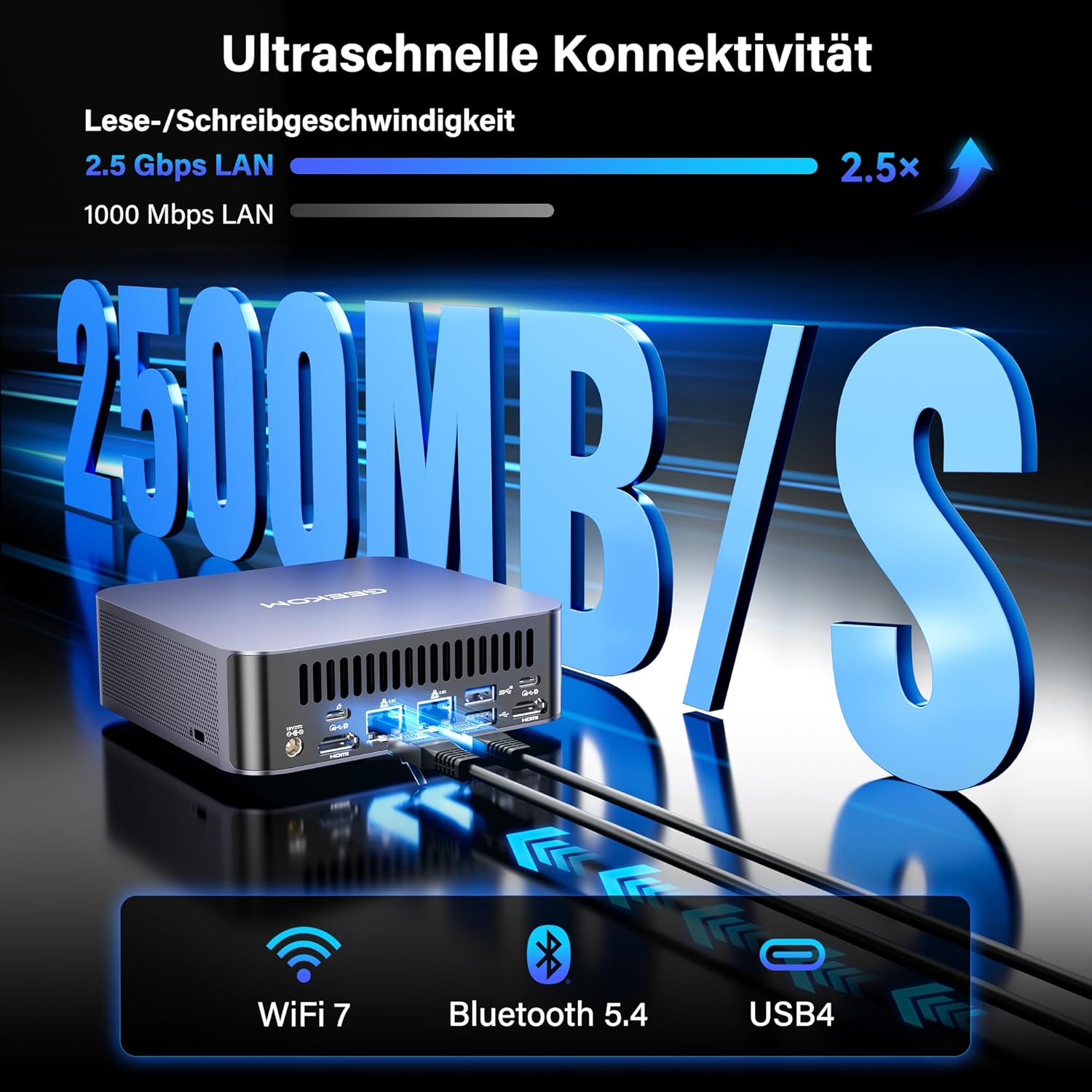 • [Отлична свързаност] Мини компютърът GT2 Mega е оборудван с два мощни процесора: Двойните USB4 портове предлагат 40 Gbps честотна лента и заместват Oculink за директно свързване на външни графични разширения. Два 2.5 Gbps Ethernet порта постигат 5 Gbps чрез агрегиране на връзки, осигурявайки стабилен и високоефективен трафик на данни. Това съчетава свързаност на устройства на ниво работна станция с мрежова производителност на ниво сървър.