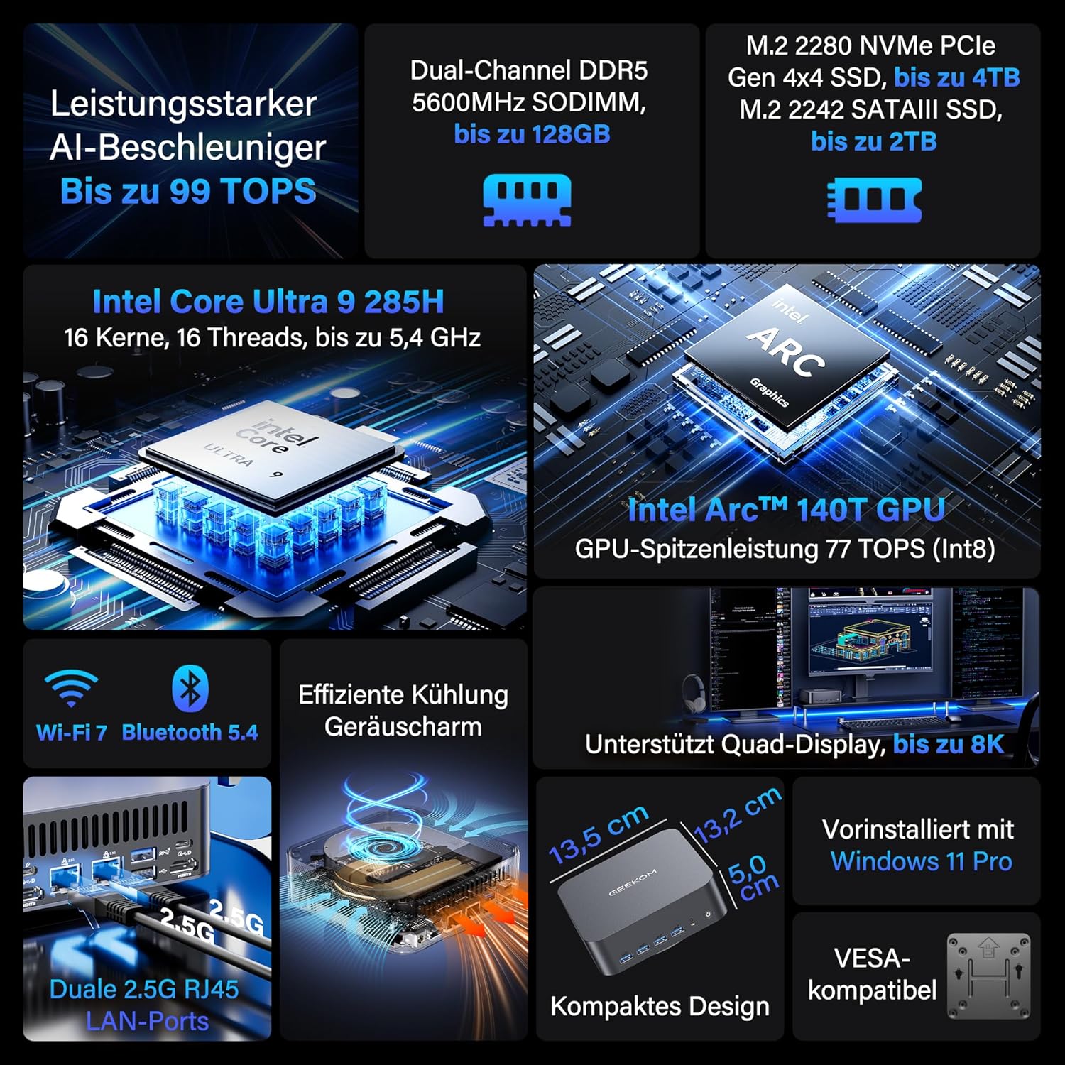 GEEKOM [TOP AI] Мини компютър GT2 Mega с Intel Core 9 285H (15-то поколение), 32GB DDR5 + 2TB SSD, мини компютър Windows 11 Pro с 8x USB | 2.5G двоен LAN | 4x 4K изхода | WiFi 7 за всички сценарии на внедряване