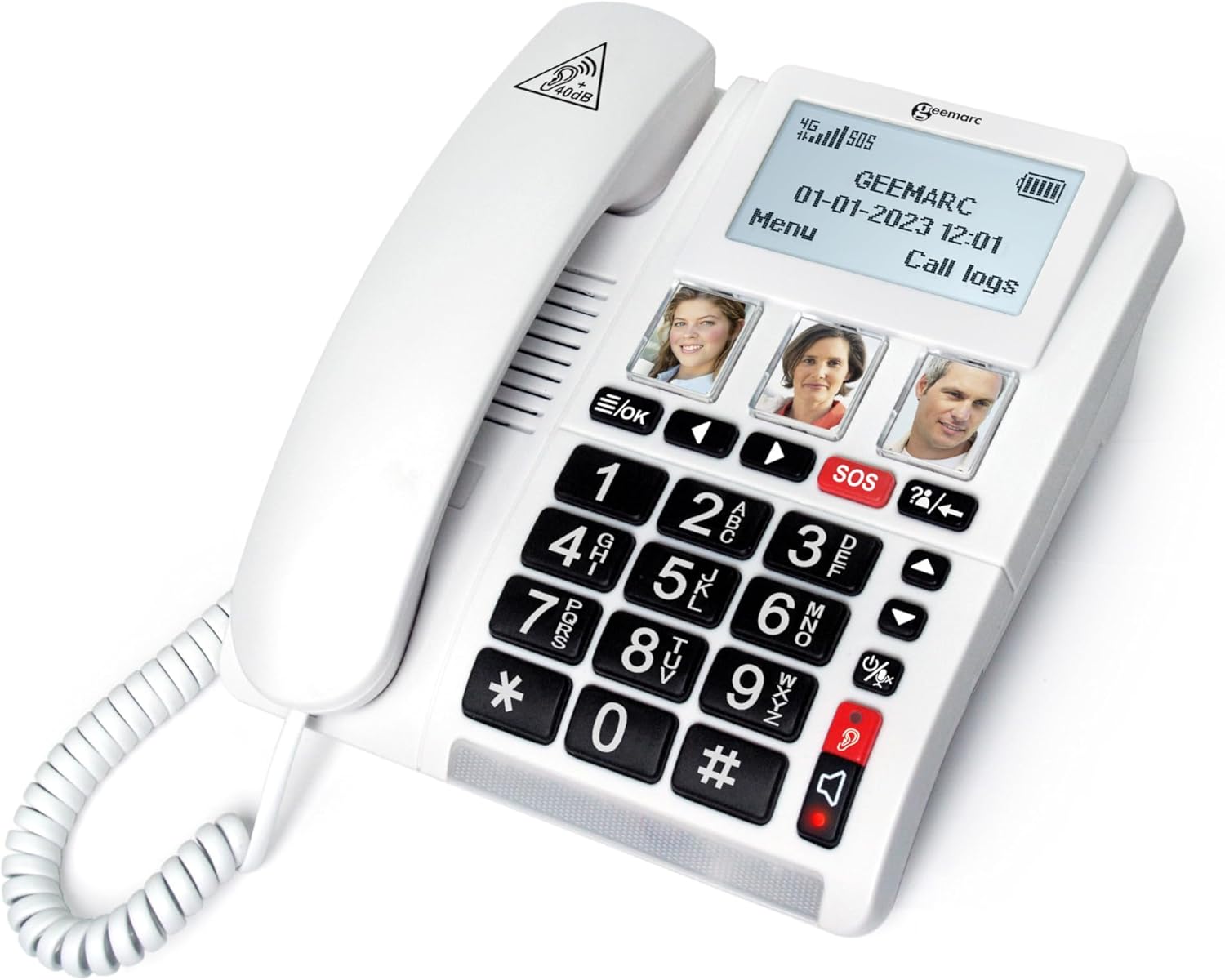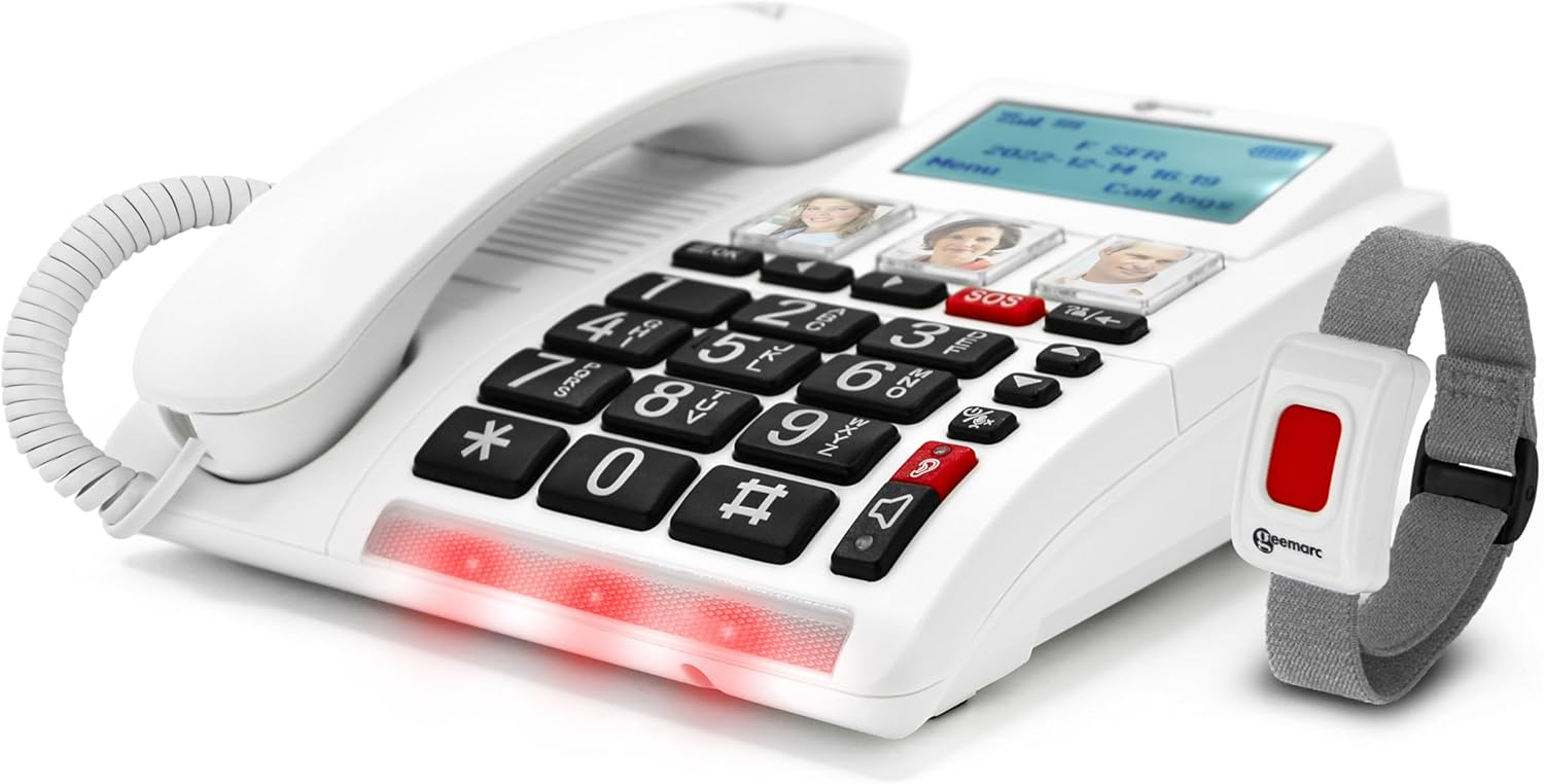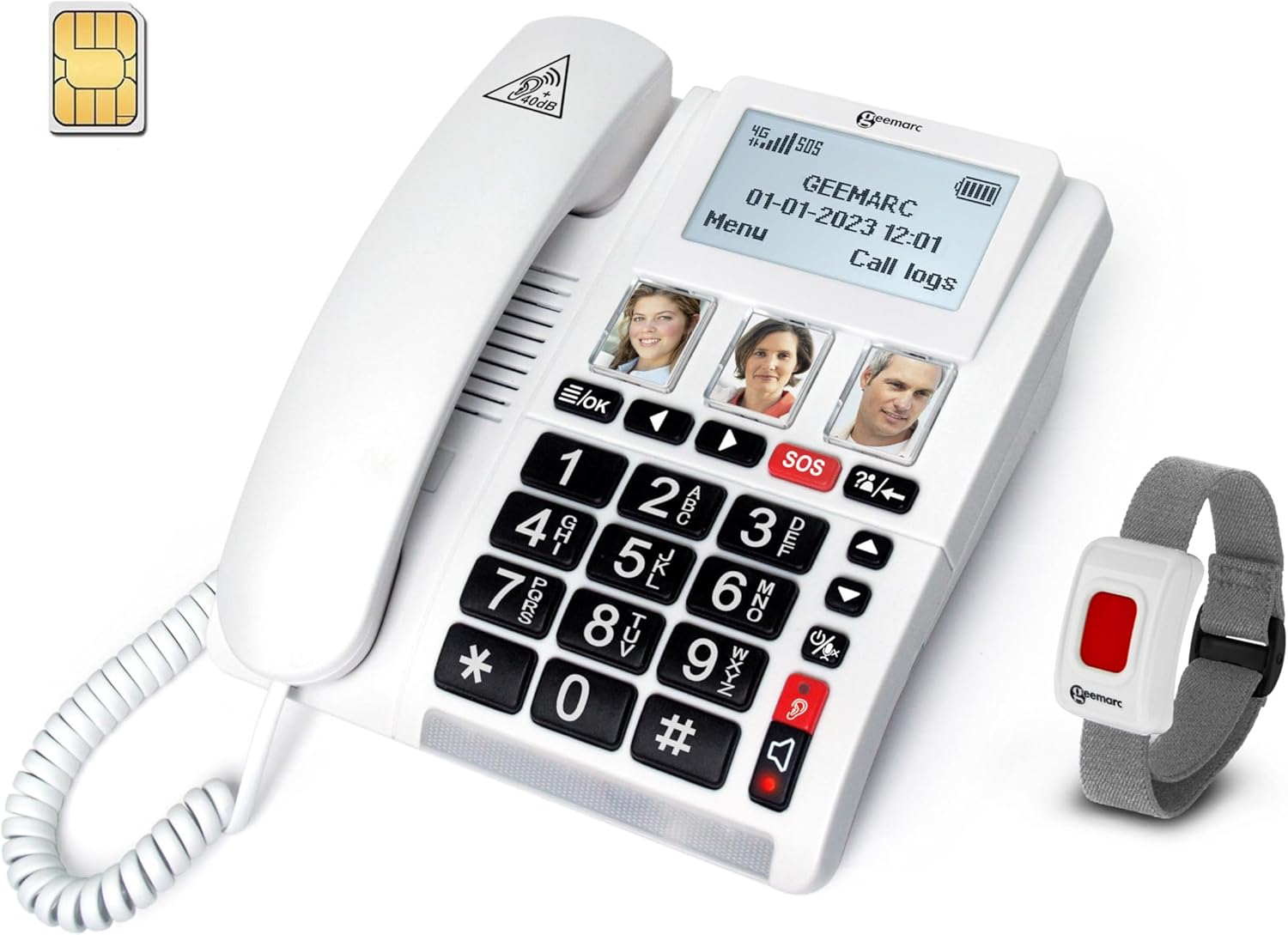 Geemarc CL9000 - Домашен телефон за спешни случаи и водоустойчива SOS гривна с големи бутони, усилена сила на звука и осветен дисплей - Работи само със SIM карта